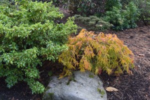 Skimmia “Kew Green” has unusual green flowers instead of the usual reddish shades, while the Witch Hazels sport many shades of yellow.