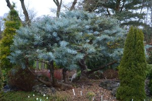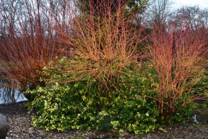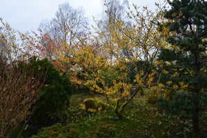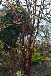 Skimmia “Kew Green” has unusual green flowers instead of the usual reddish shades, while the Witch Hazels sport many shades of yellow.