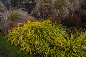 Conifers, grasses and trees and shrubs with coloured stems and bark give a common theme throughout. The first two photos below show the matching gold coloured foliage of a group of conifers and a swathe of grasses.