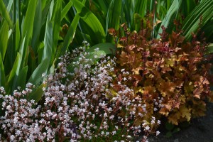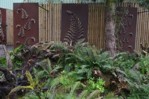 Metal panels with cut-out shapes of fern leaves reflect the planting beneath them in the border. John features many different versions of the low growing evergreen shrub, Leucothe. This one was a real beauty!