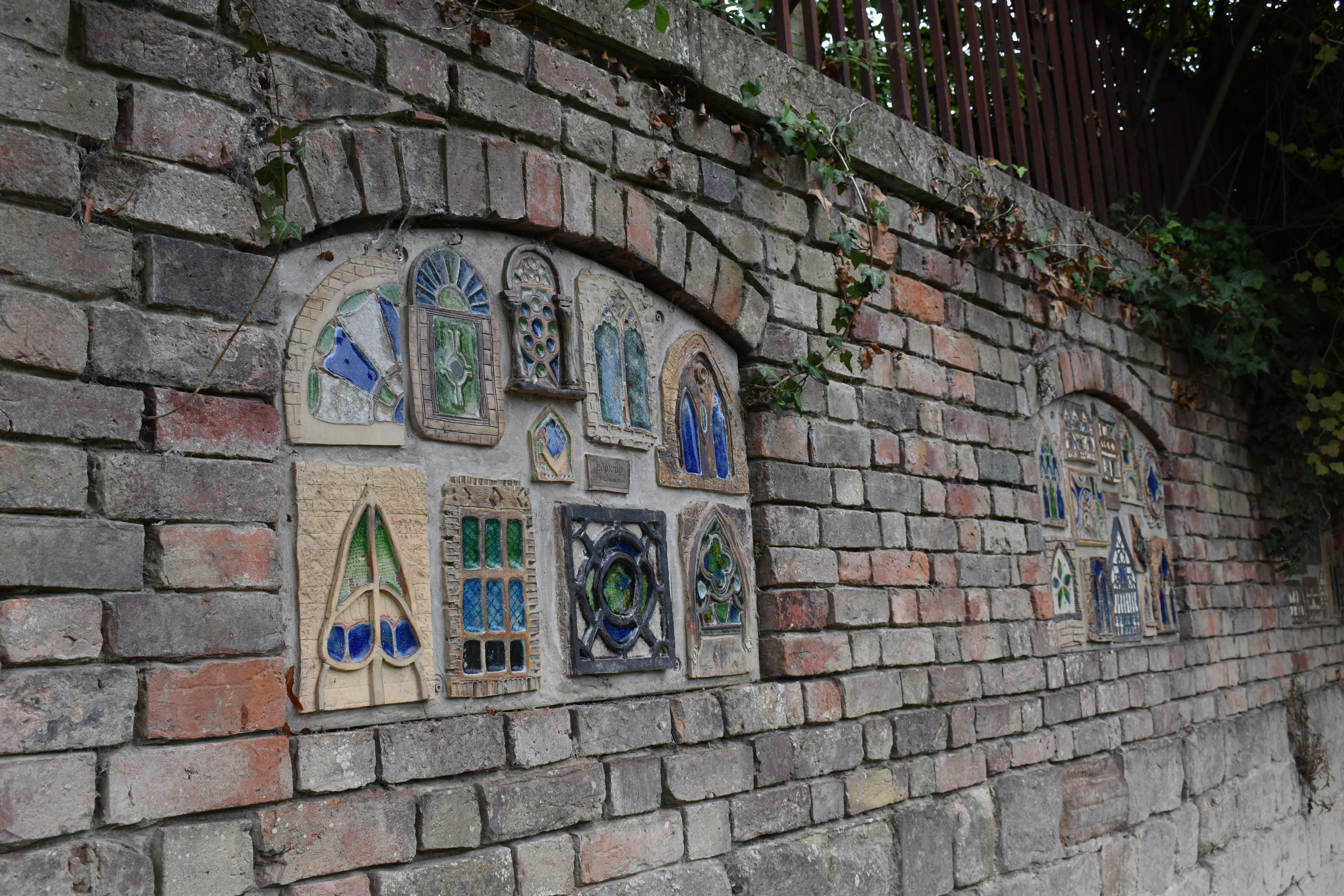 Our riverside walk was full of surprises, such as a clay tile piece of craftwork created by a local school, a beautiful modern building sat above the ancient town walls, the oh so steep St Mary’s Water Lane and a determined rose bush!