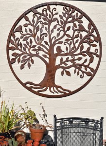 It is a corten steel relief sculpture of a Tree of Life, which looks wonderful against a newly painted brick wall. It features three birds enjoying its branches.