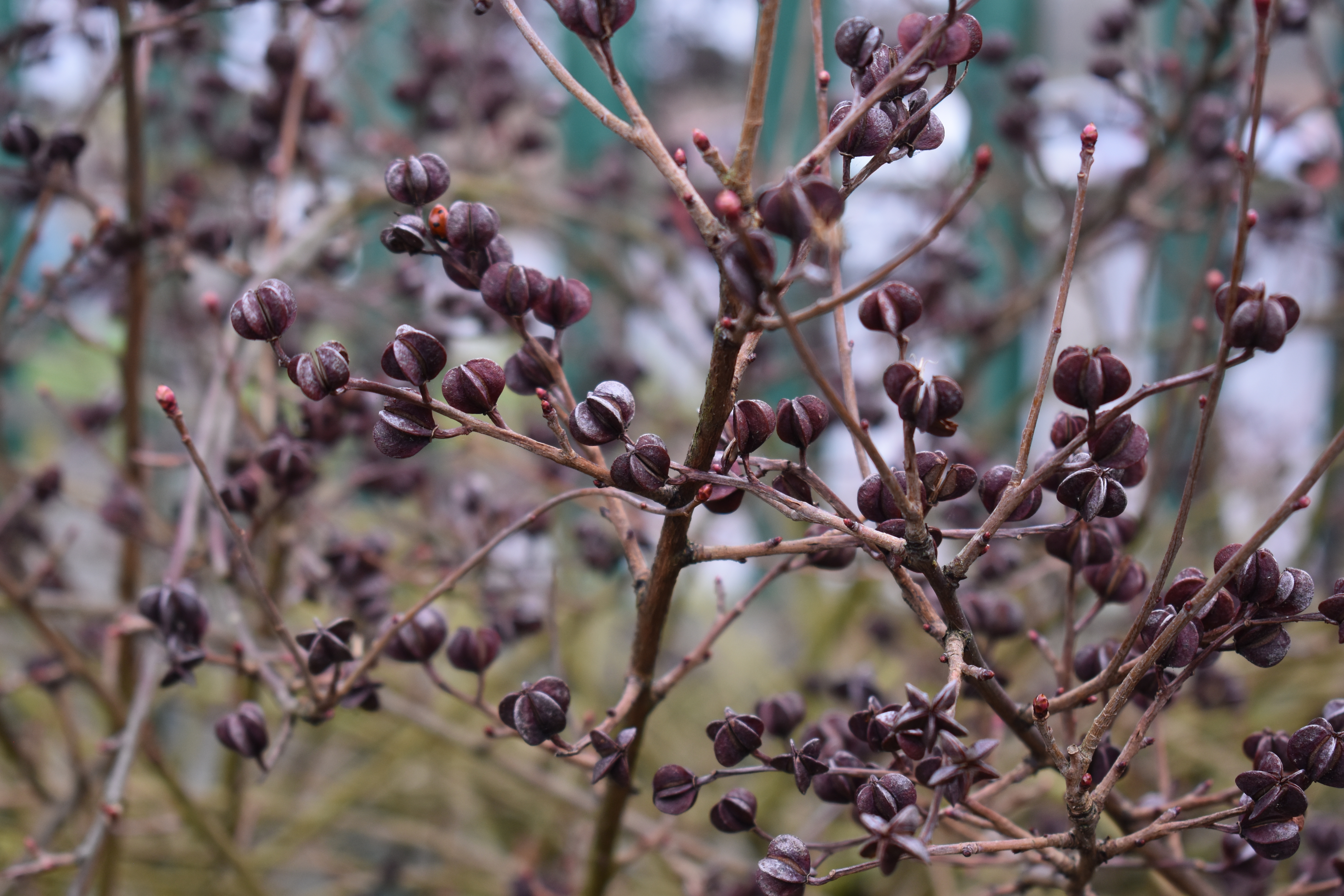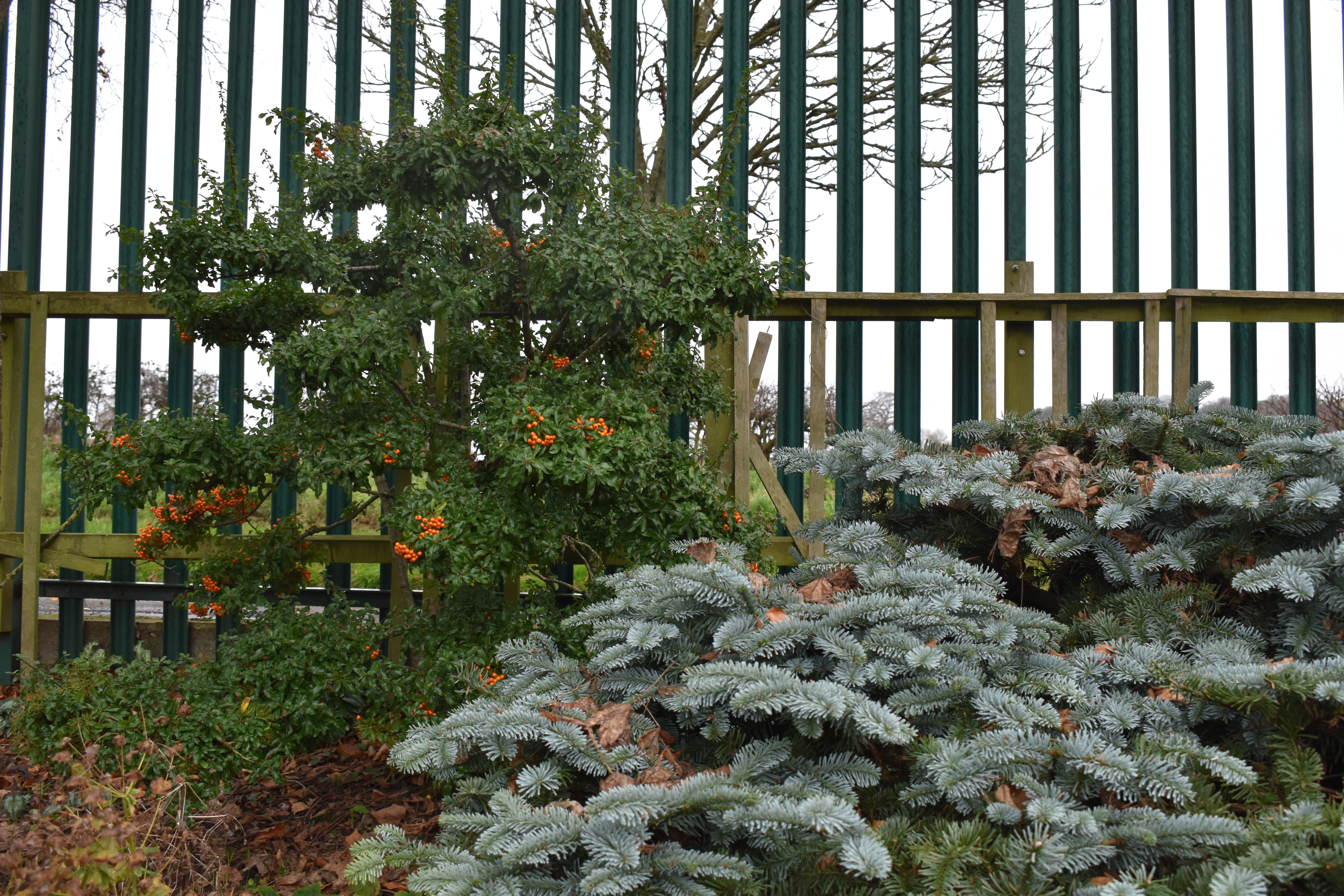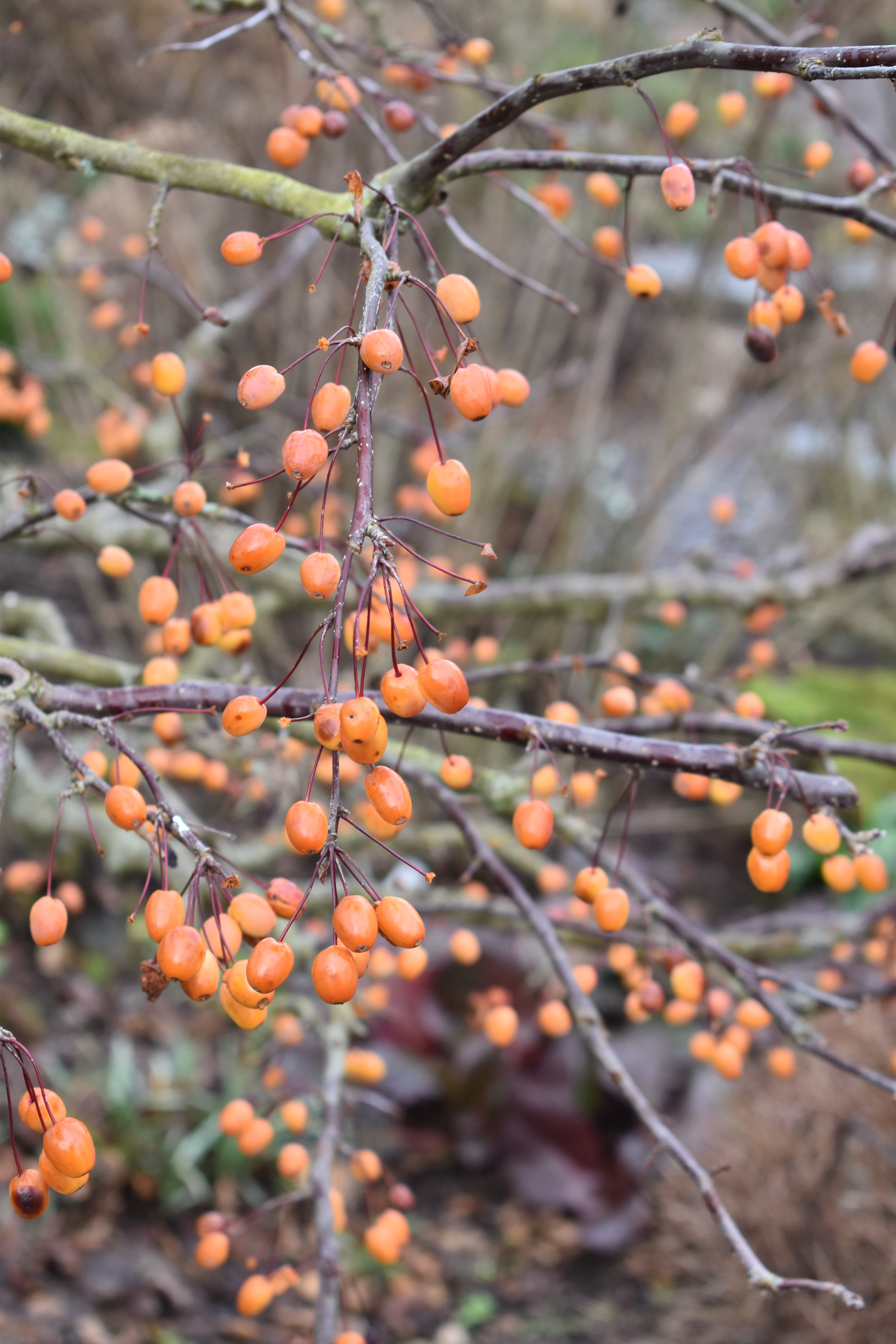 The orange berries below are Viburnum opulus, a close relative of our native red berried version on the left and a crab apple on the right.