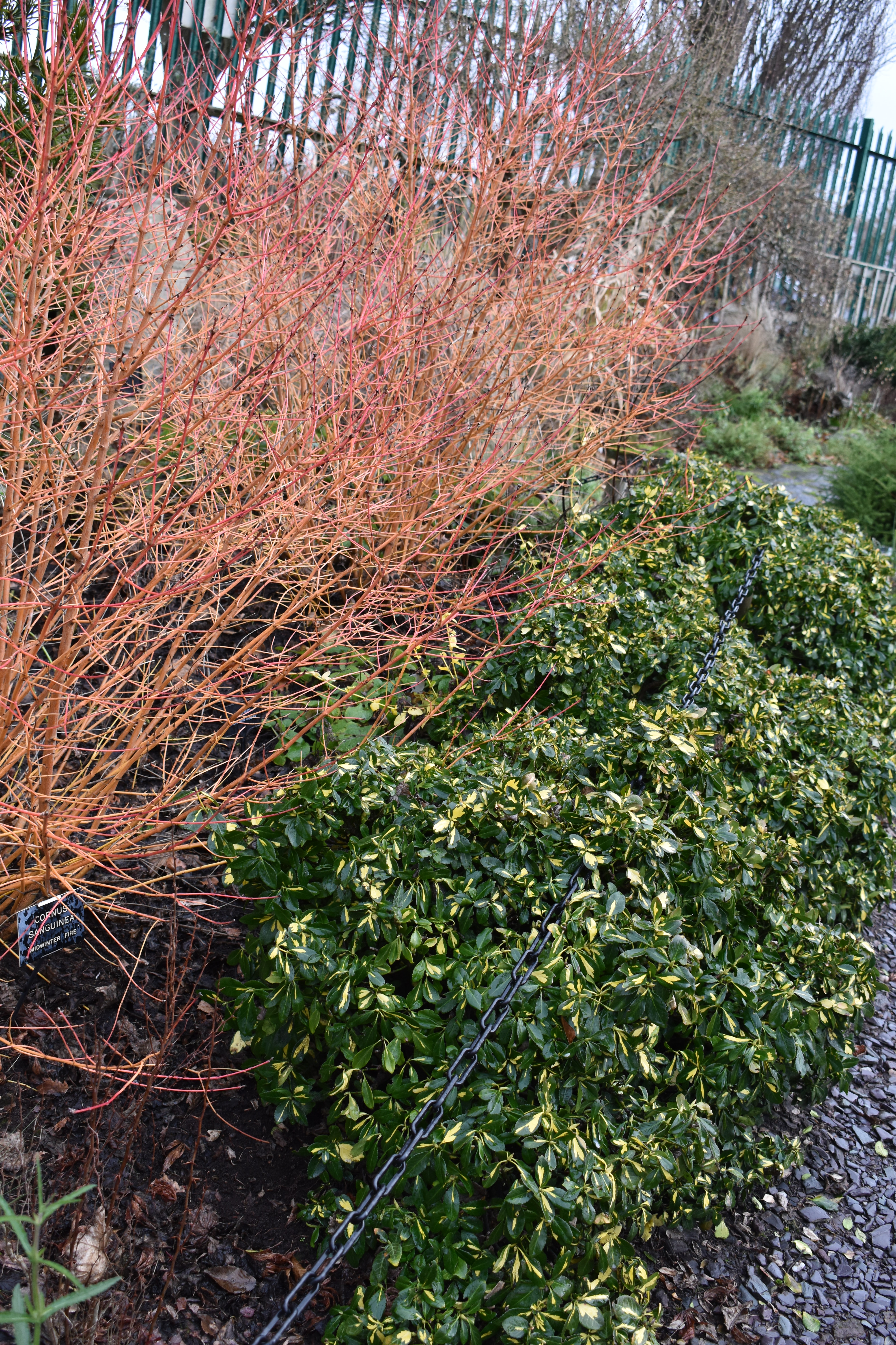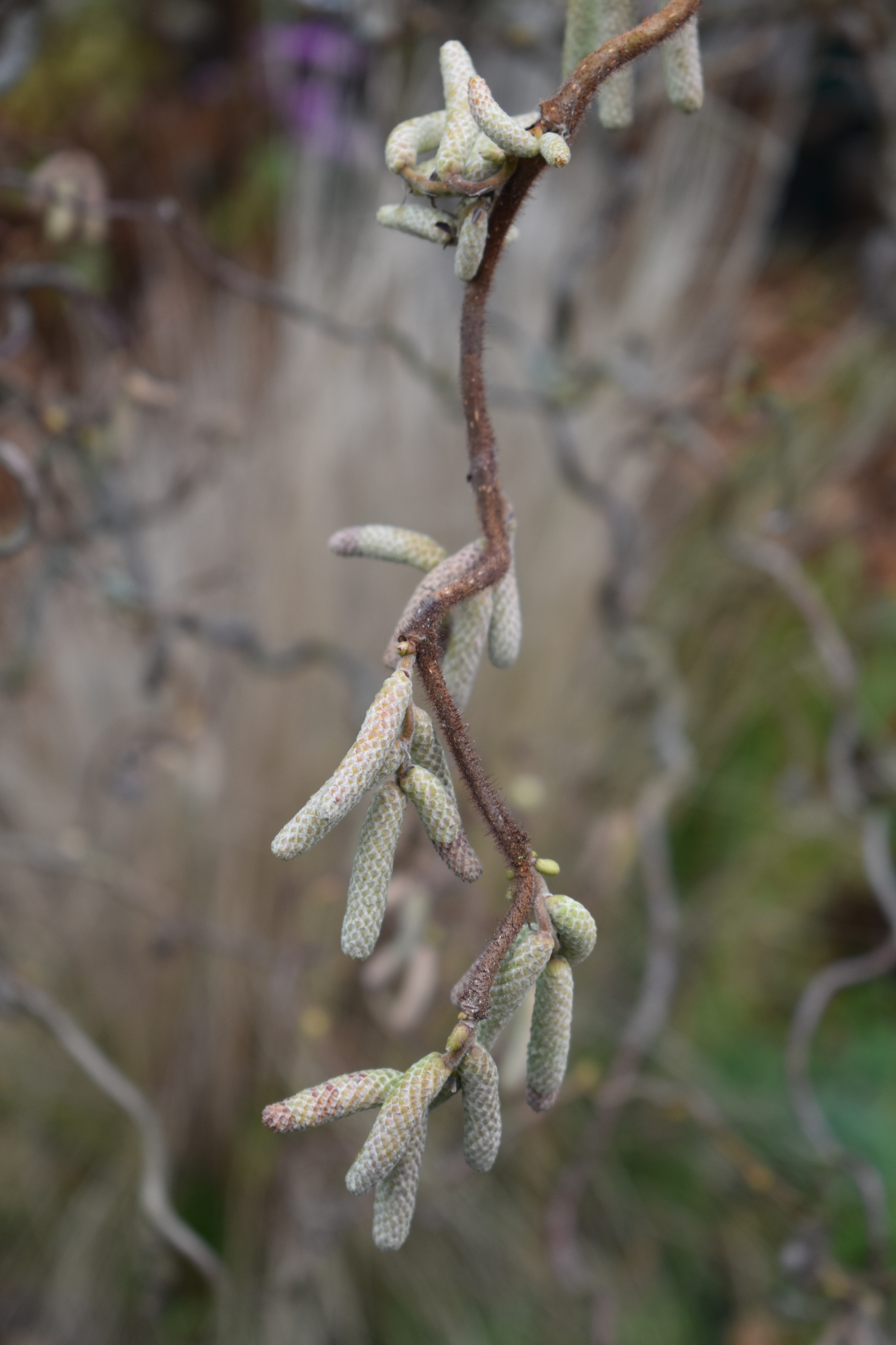 A favourite shrub here as in so many gardens in winter is Cornus “Midwinter Fire” which shines out on dull days and sunny ones alike. A much more subtly coloured feature of a winter garden is the appearance of catkins on a contorted purple hazel and its plain green cousin.