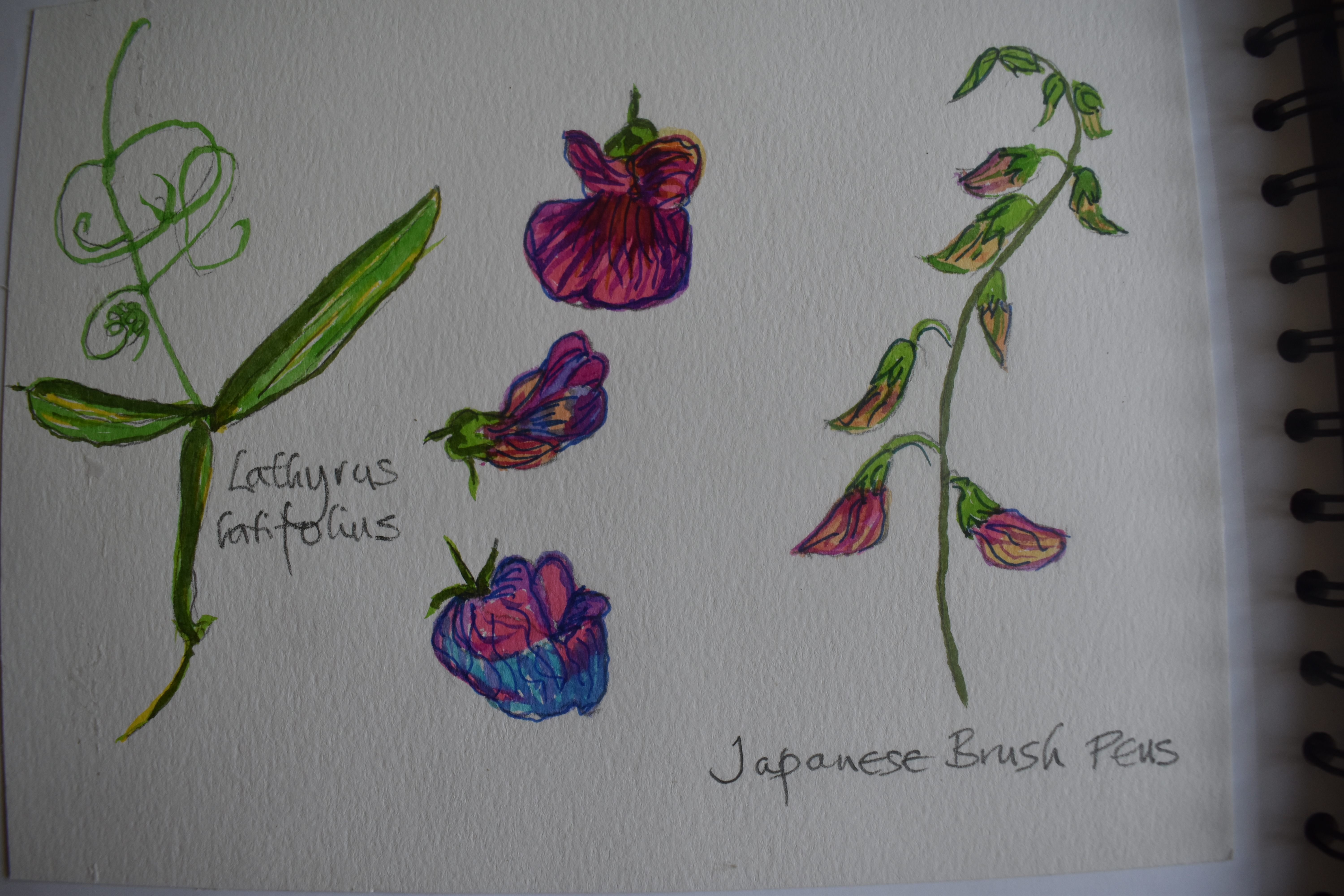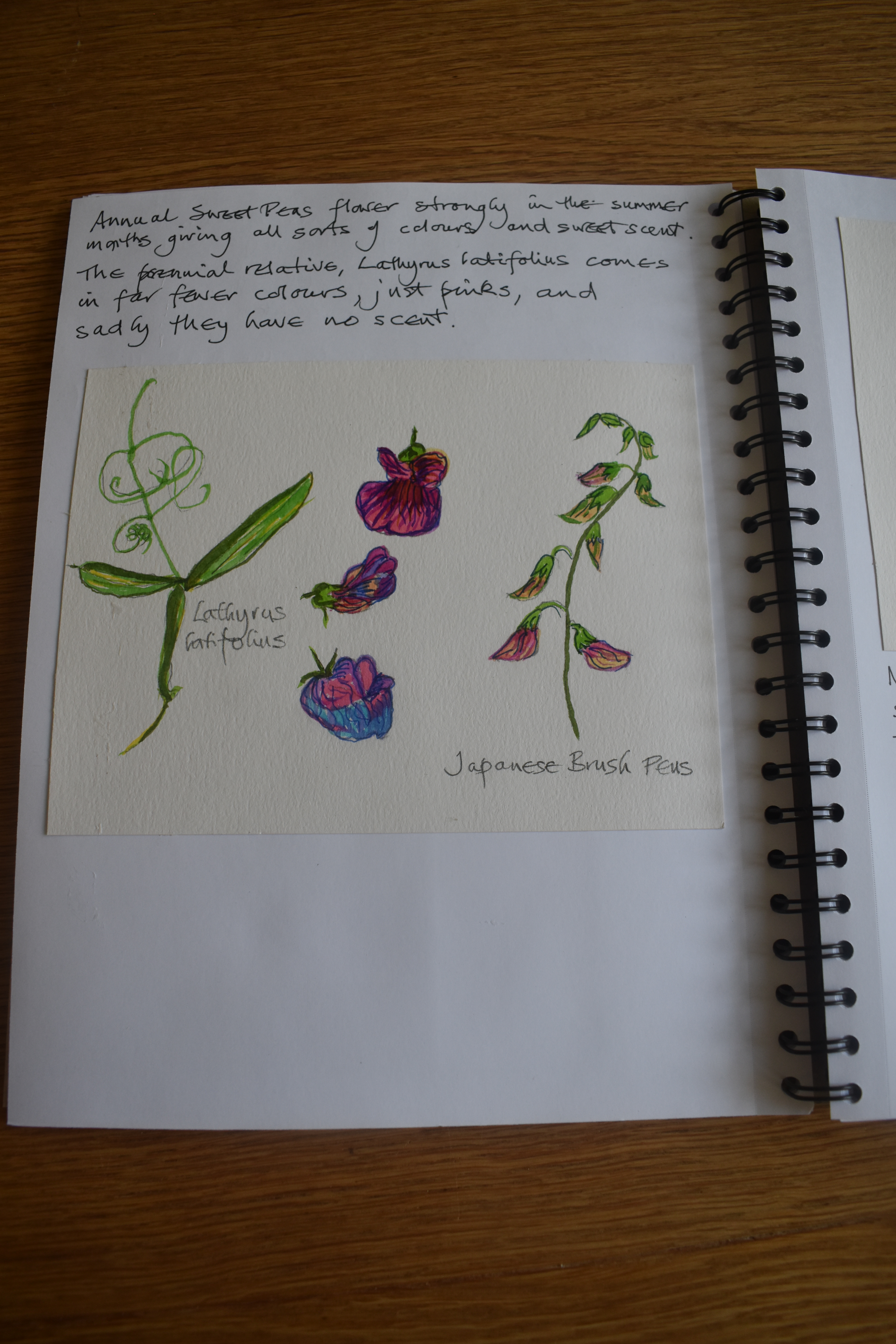 Over onto the second page of the August entries I shared my sketches of our everlasting sweet pea after writing, “Annual sweet peas flower strongly in the summer giving all sorts of colours and sweet scent. The perennial relatives, Lathyrus latifolius, comes in far fewer colours, just pinks, and sadly no scent.”