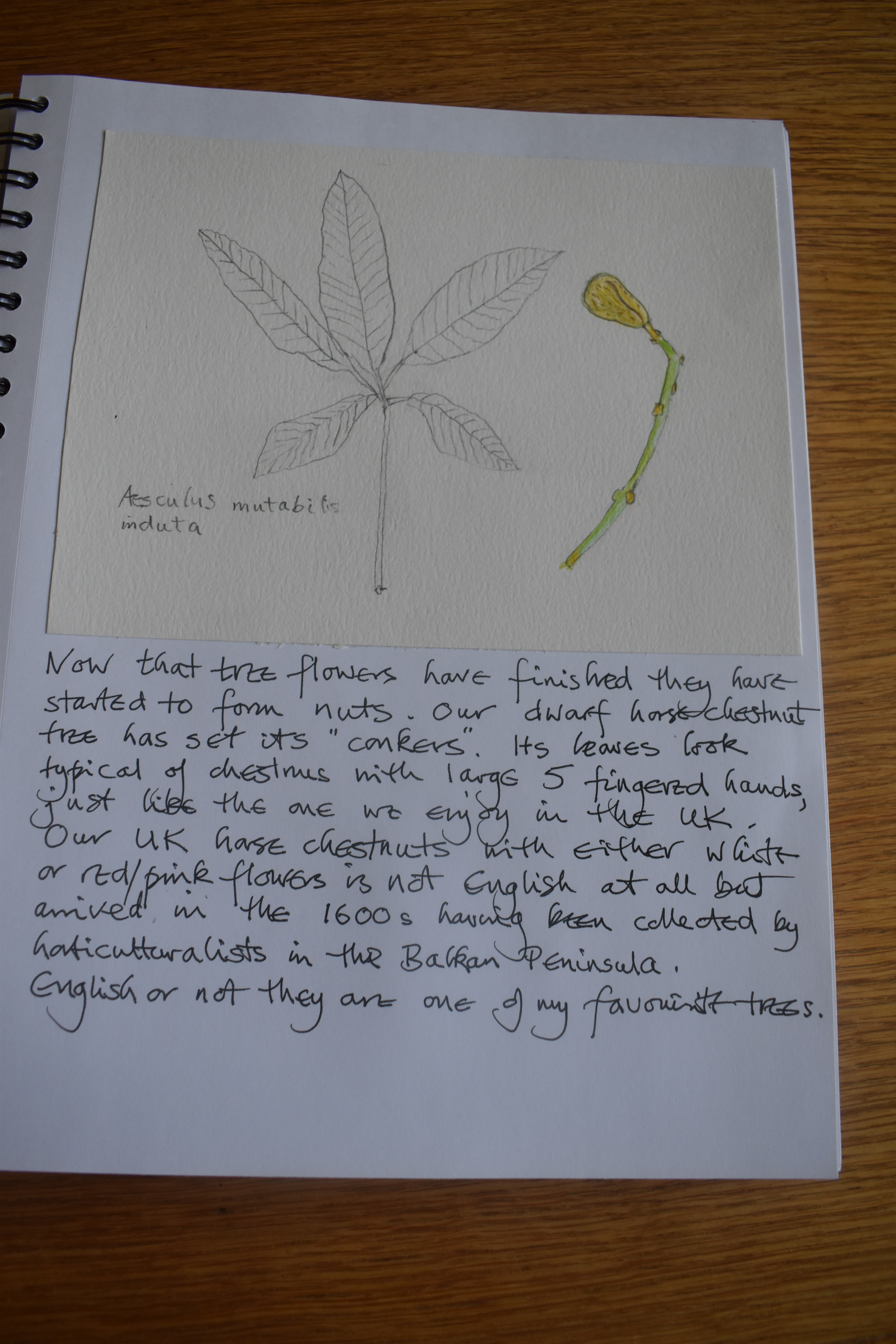 I share more sketches over the following three pages, beginning with pencil and crayons for the dwarf chestnut. I noted that, “Now that tree flowers have finished they have started to form nuts or fruit. our dwarf horse chestnut tree has set its ‘conkers’. Its leaves look typical of chestnuts with large 5-fingered hands, just like the one we enjoy in the UK. Our UK horse chestnuts with either white or red/pink flowers are not English at all but arrived in the 1600s having been collected in the Balkan Peninsula. English or not they are one of my favourite trees.”