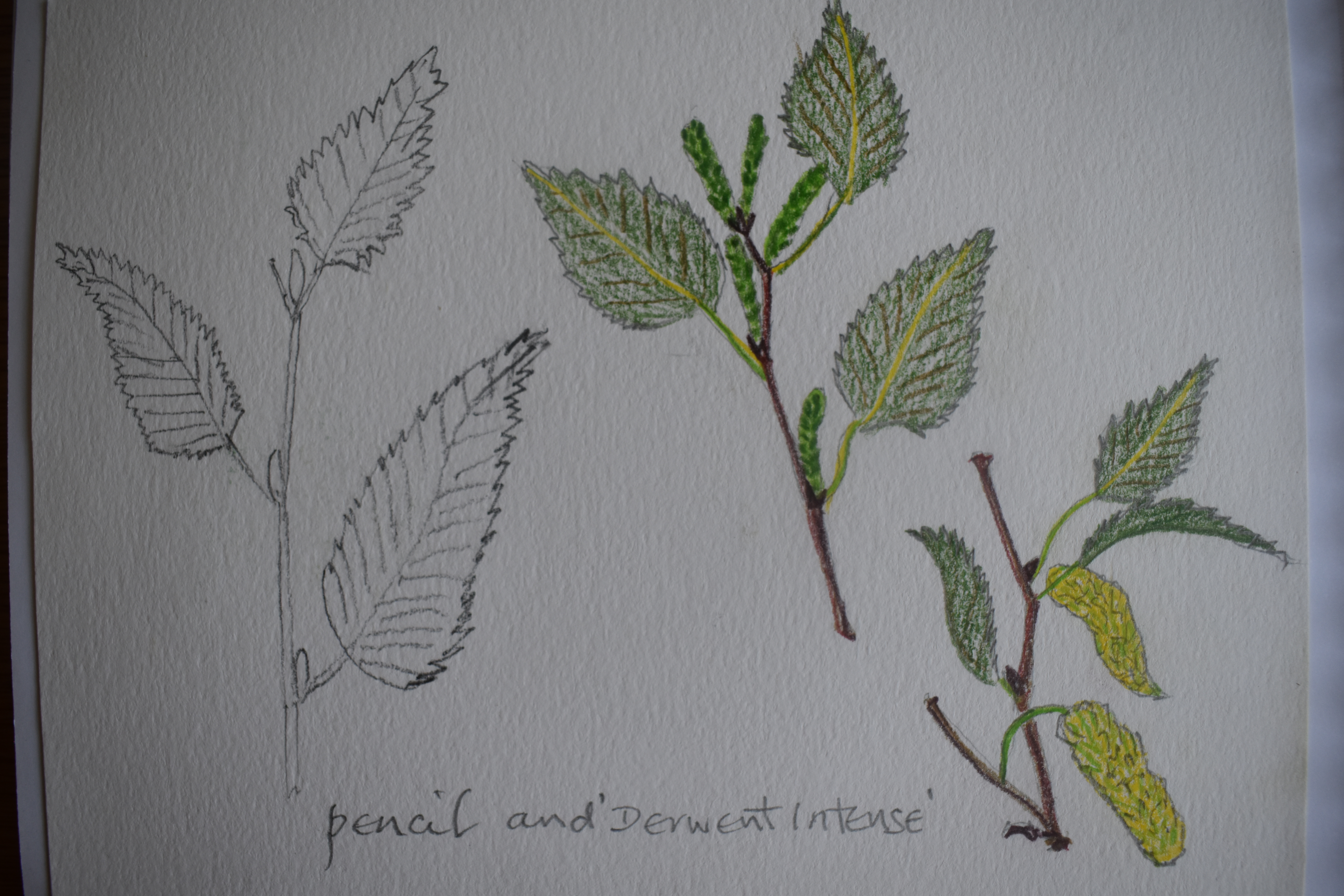 The sketch using pencil and Derwent Intense pencil crayons, illustrate the foliage and flowers of Betula albosinensis ‘Chinese Ruby’.