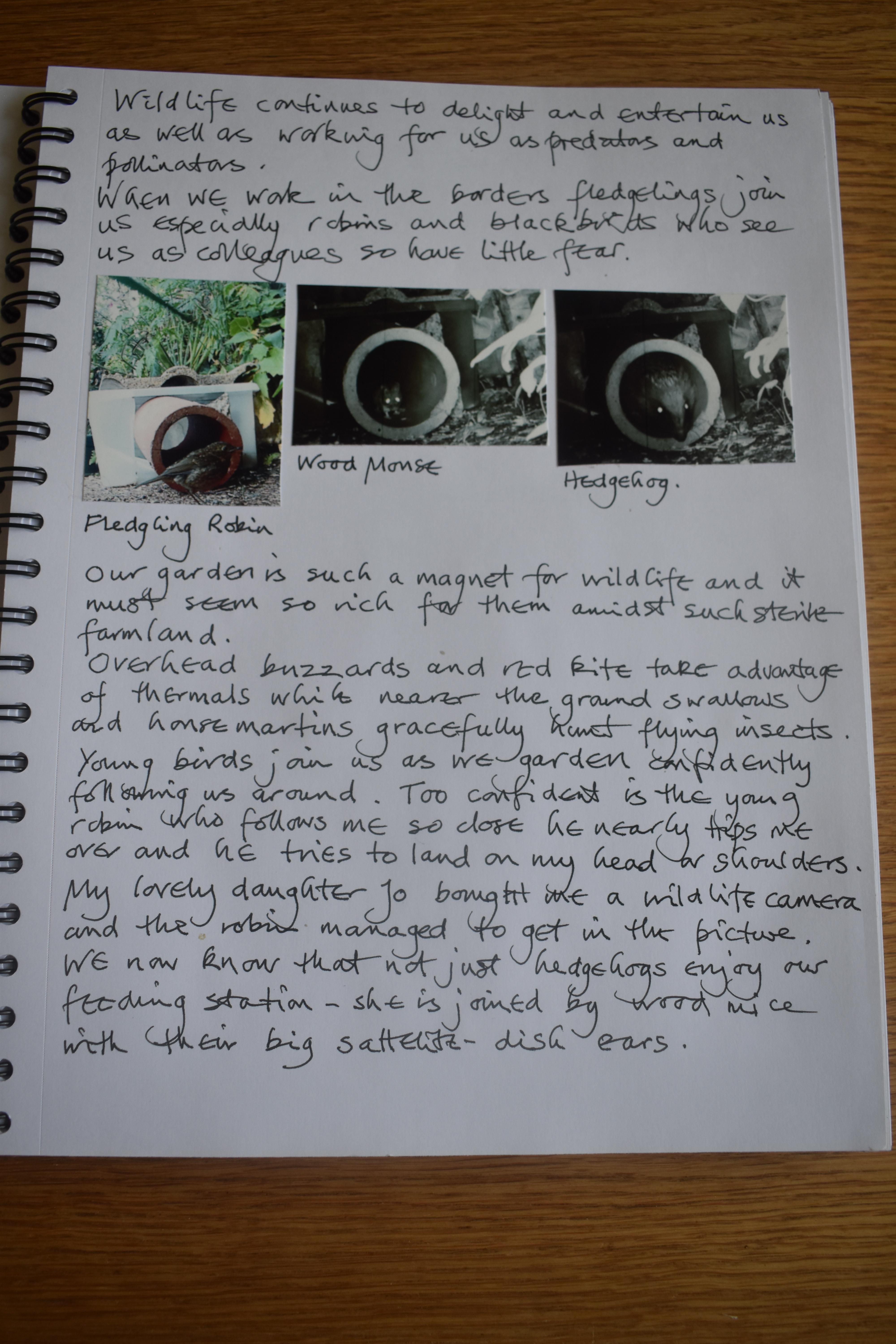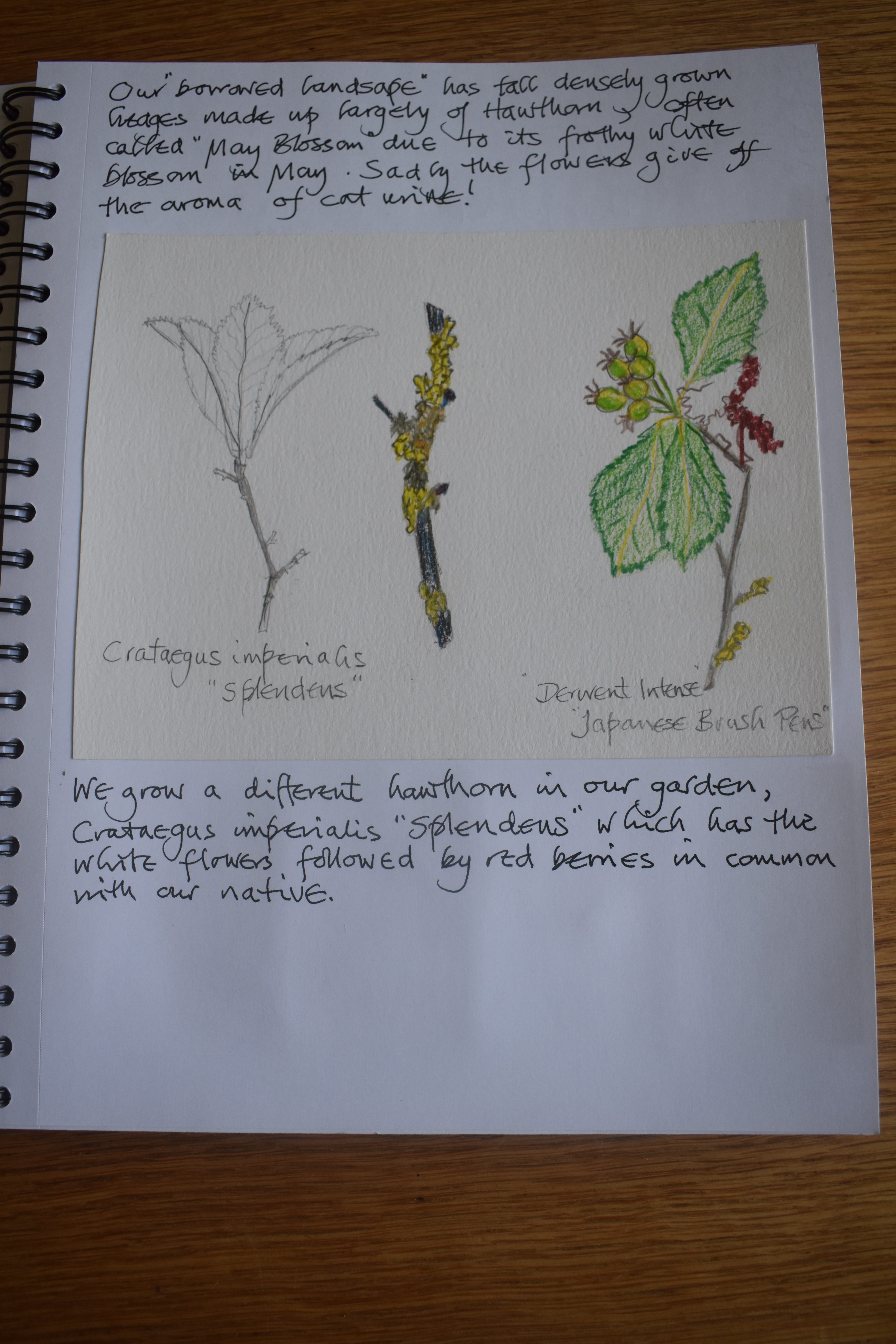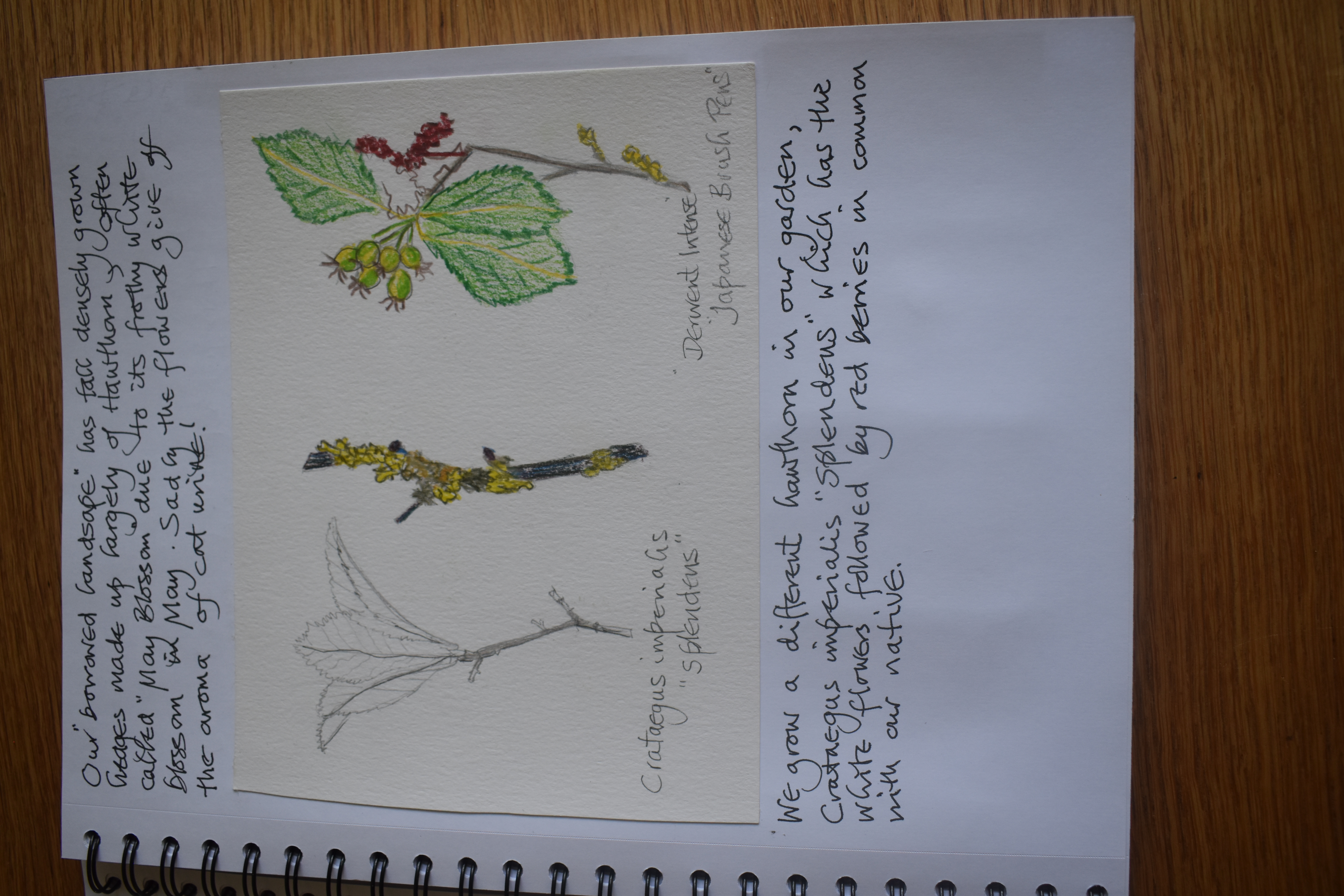 The next page featured a further small tree and its flowers and fruit where I wrote, “Our ‘borrowed landscape’ has tall densely grown hedges made up largely of Hawthorn, often called ‘May Blossom’ due to its frothy white blossom in May. Sadly, its flowers give off the aroma of cat urine!.