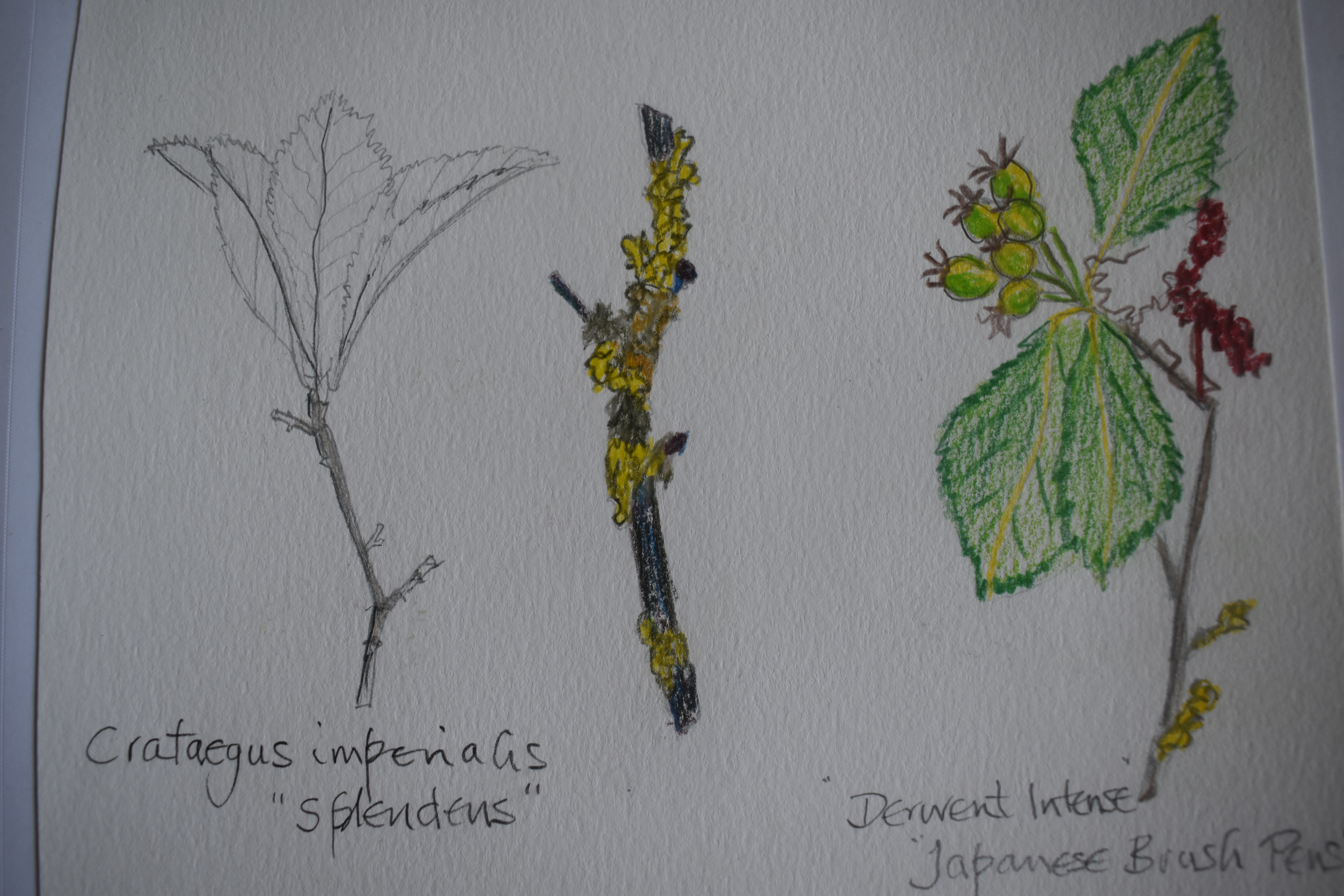 Two further sketches of tree foliage and fruit follow on, the first being one of our birches. I noted that, “We have several forms of Betula albosinensis around the garden and these are showing signs of developing both male and female flowers. Male flowers will become catkins as the seasons move on.”