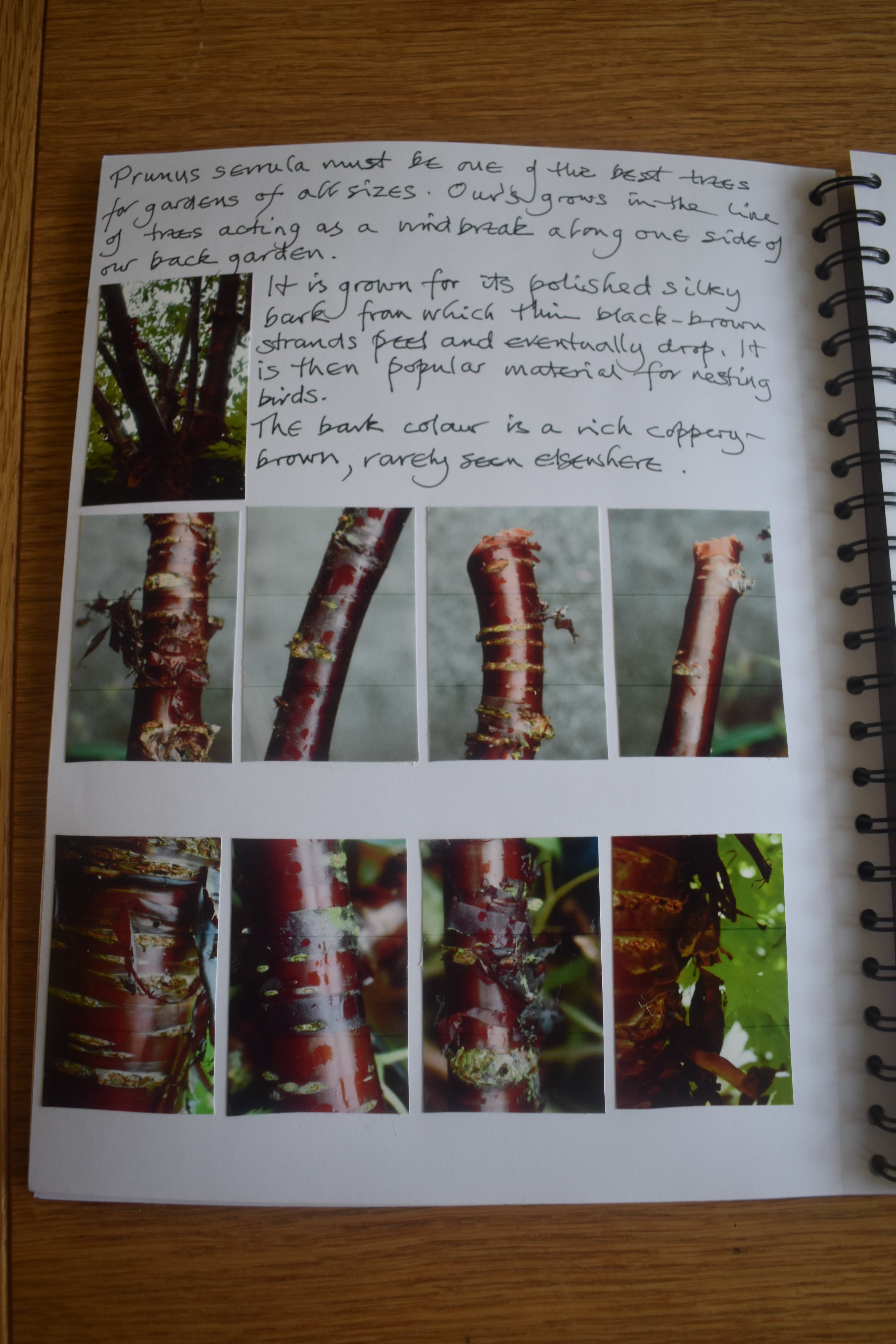 Turning the page once again I feature another of our trees but this time I look at its bark in particular. I wrote that, “Prunus serrula must be one of the best trees for gardens of all sizes. Our’s grows in the line of trees acting as a windbreak along one side of our back garden.