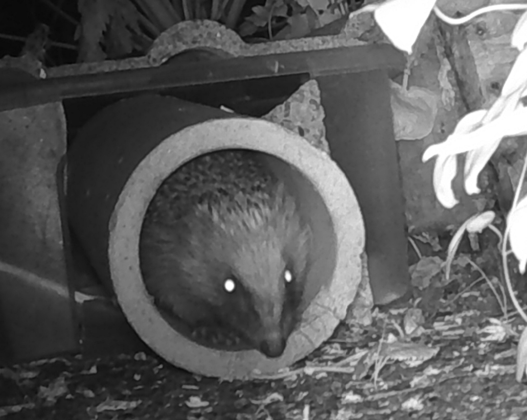 Our lovely daughter Jo bought me a wildlife camera and the robin managed to get in the picture. We now know that not just hedgehogs enjoy our feeding station – she is joined by wood mice with their big satellite dish ears.”