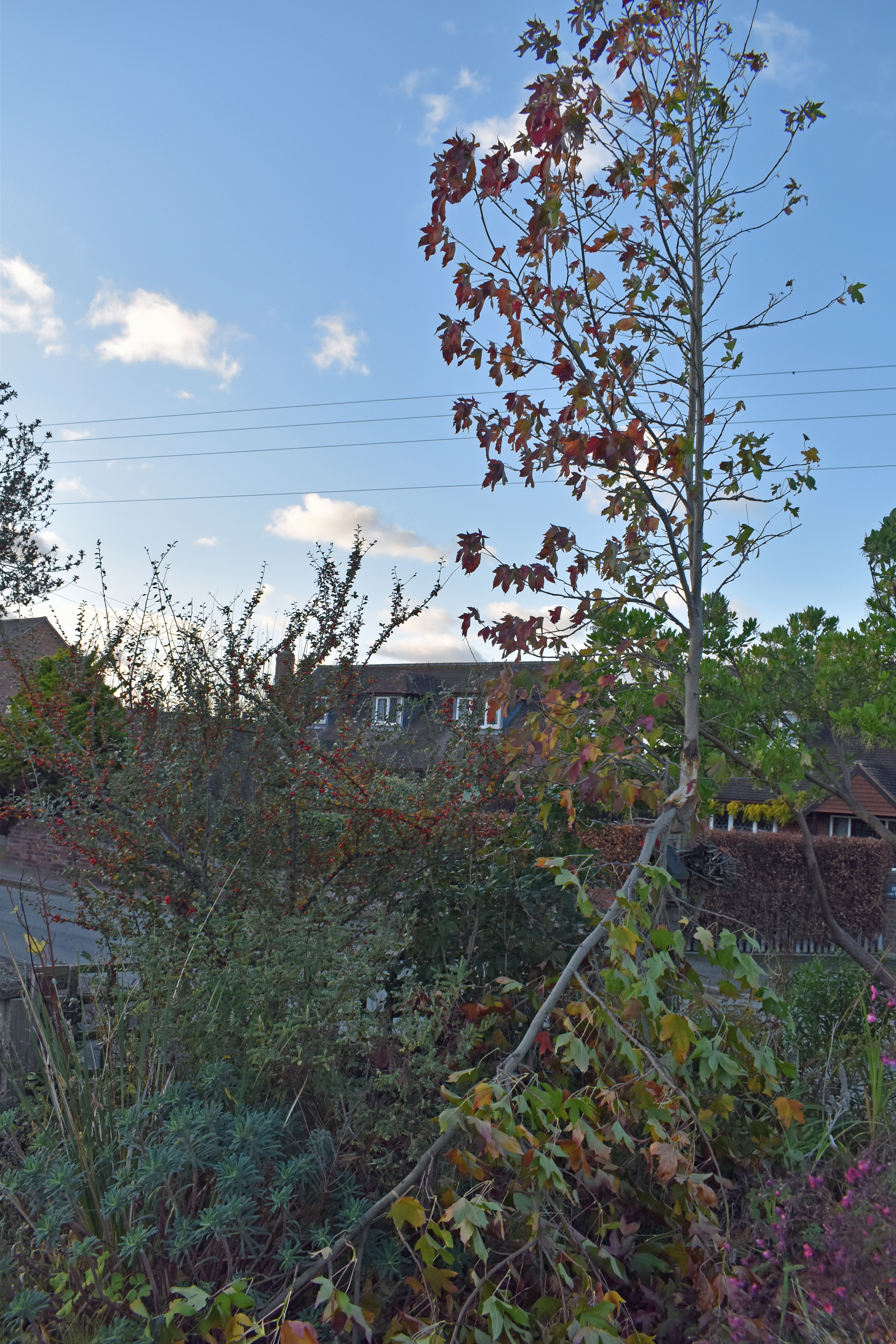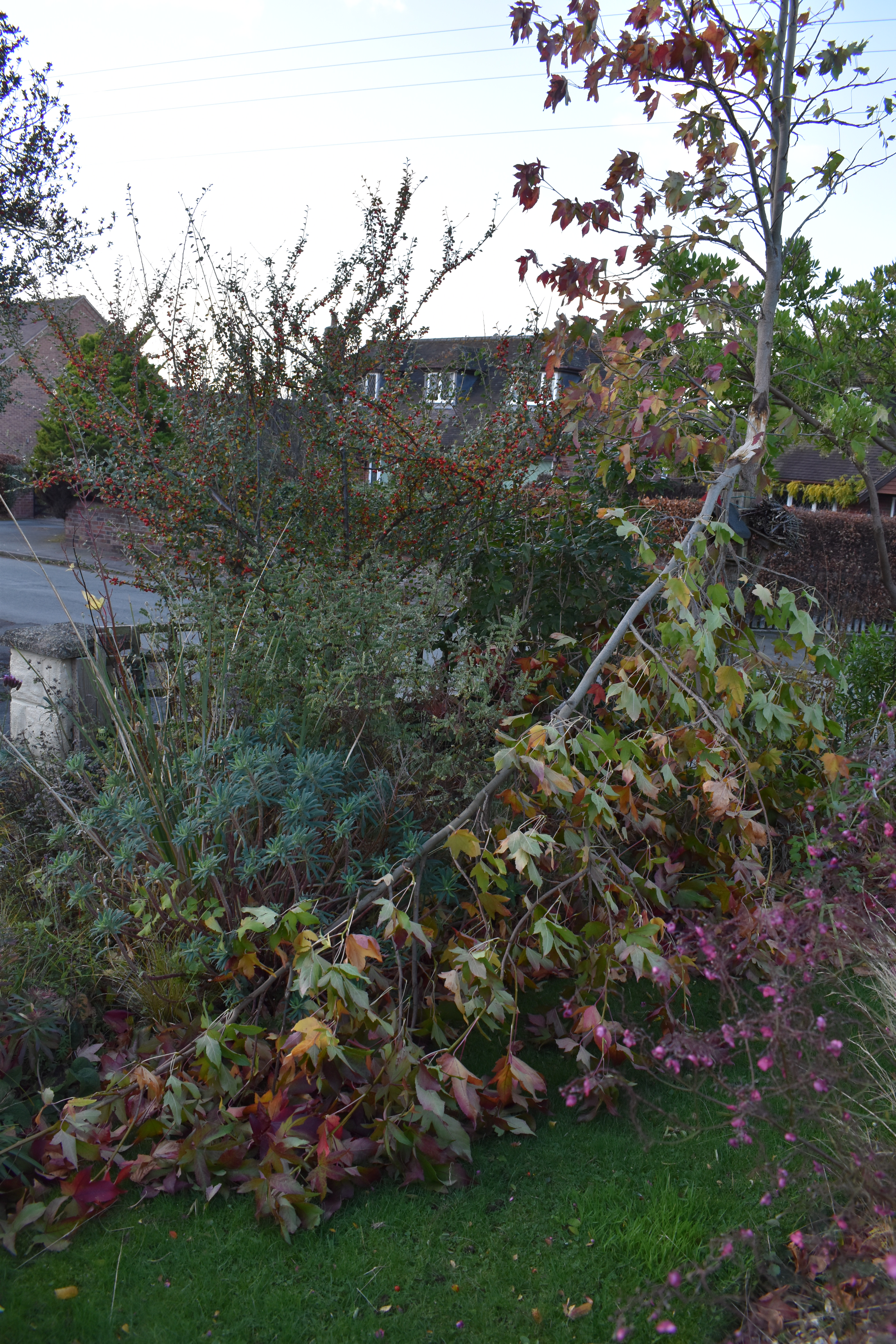 A group of six photos showed some of the damage caused by Storm Arwen. Beneath them I noted that, “Grasses, fences and half of our Liquidamber tree have been broken by Storm Arwen.”