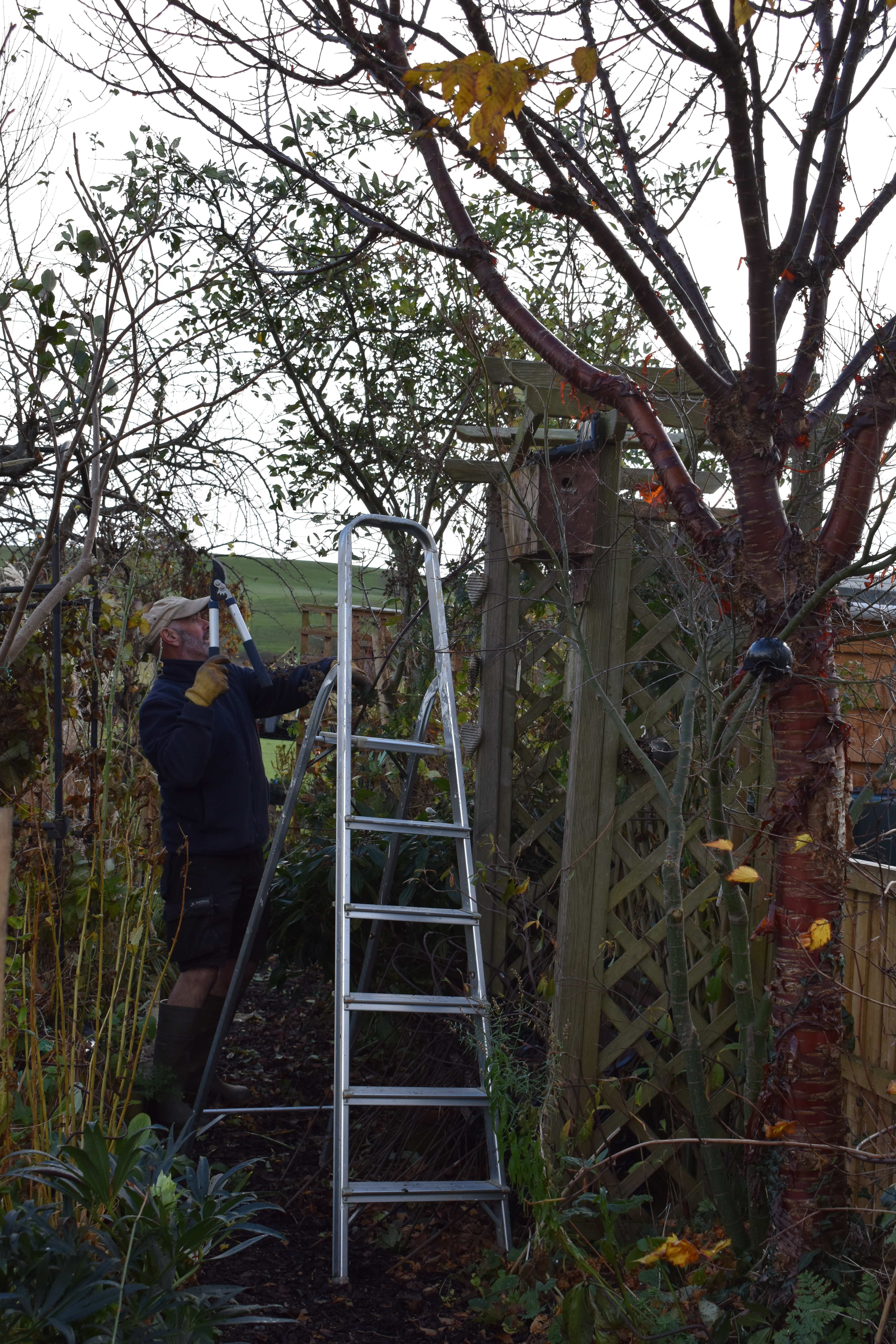 I also included two photos showing a couple of usual seasonal work, planting a new climbing rose to replace Rosa ‘Falstaff’ and Ian our gardener pruning the blackberry plant. I wrote, “Normal garden tasks happen alongside the necessary repair work after sorting Arwen’s damage.”