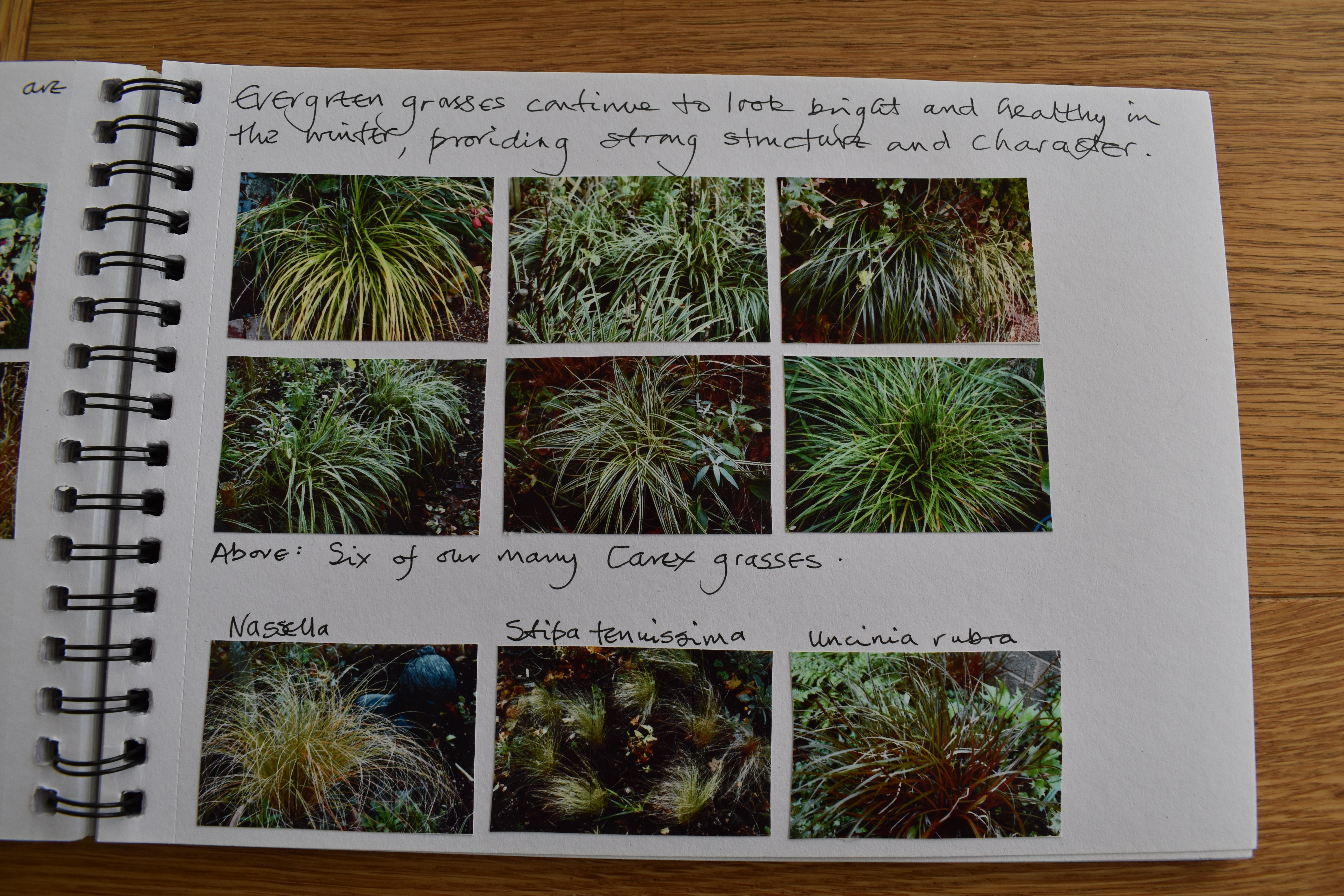 I followed on with two pages about grasses, firstly deciduous and secondly evergreens. I wrote, “The most effective light-catching plants in our garden are the many grasses we grow particularly the deciduous ones, which all add new layers of soft colours to the borders.”