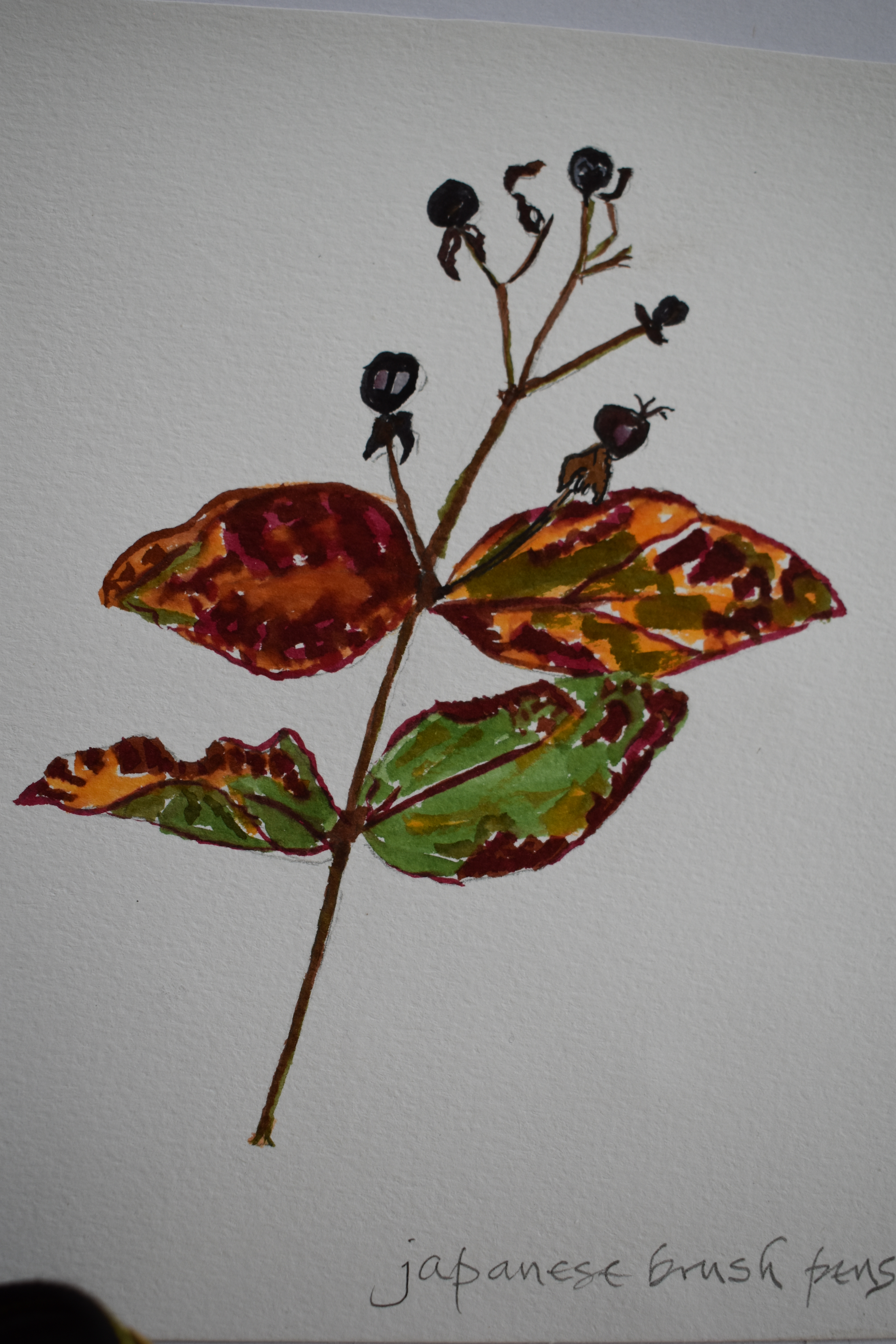 For the final page of my December report for 2021 I featured another Japanese Brush Pen drawing, this time a more colourful sketch of the winter foliage and berries of one of our many Hypericum inodorum shrubs.