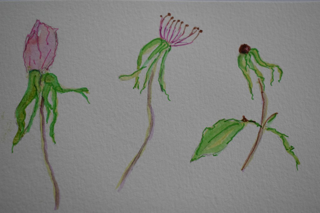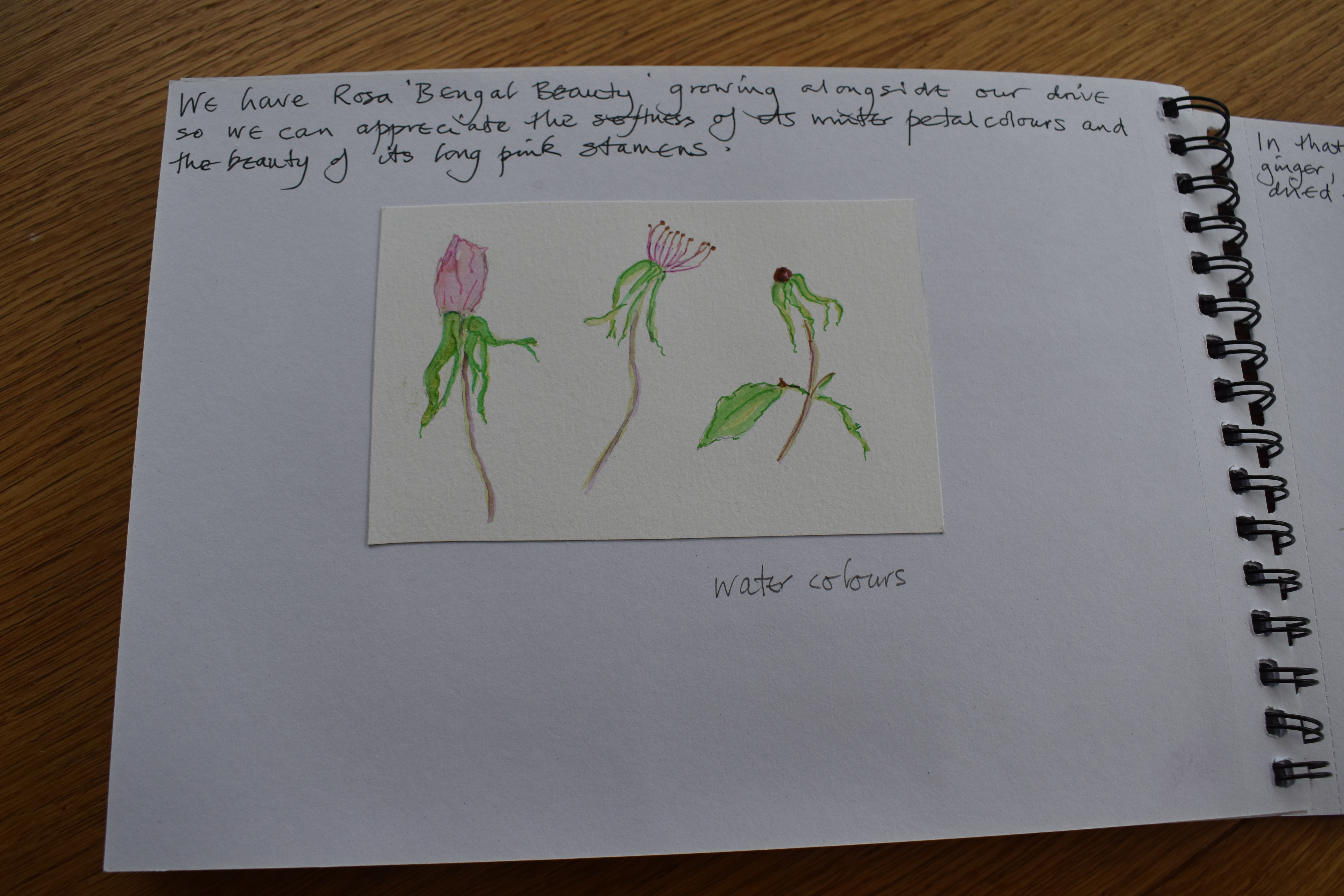 From grasses I looked back at roses, one particular rose called Rosa ‘Bengal Beauty’, a beautifully simple, single flowered shrub. I wrote, “We have Rosa ‘Bengal Beauty’ growing alongside our drive so we can appreciate the softness of its winter petal colours and the beauty of its long pink stamens.” Below I added a water colour painting of the buds at different stages.