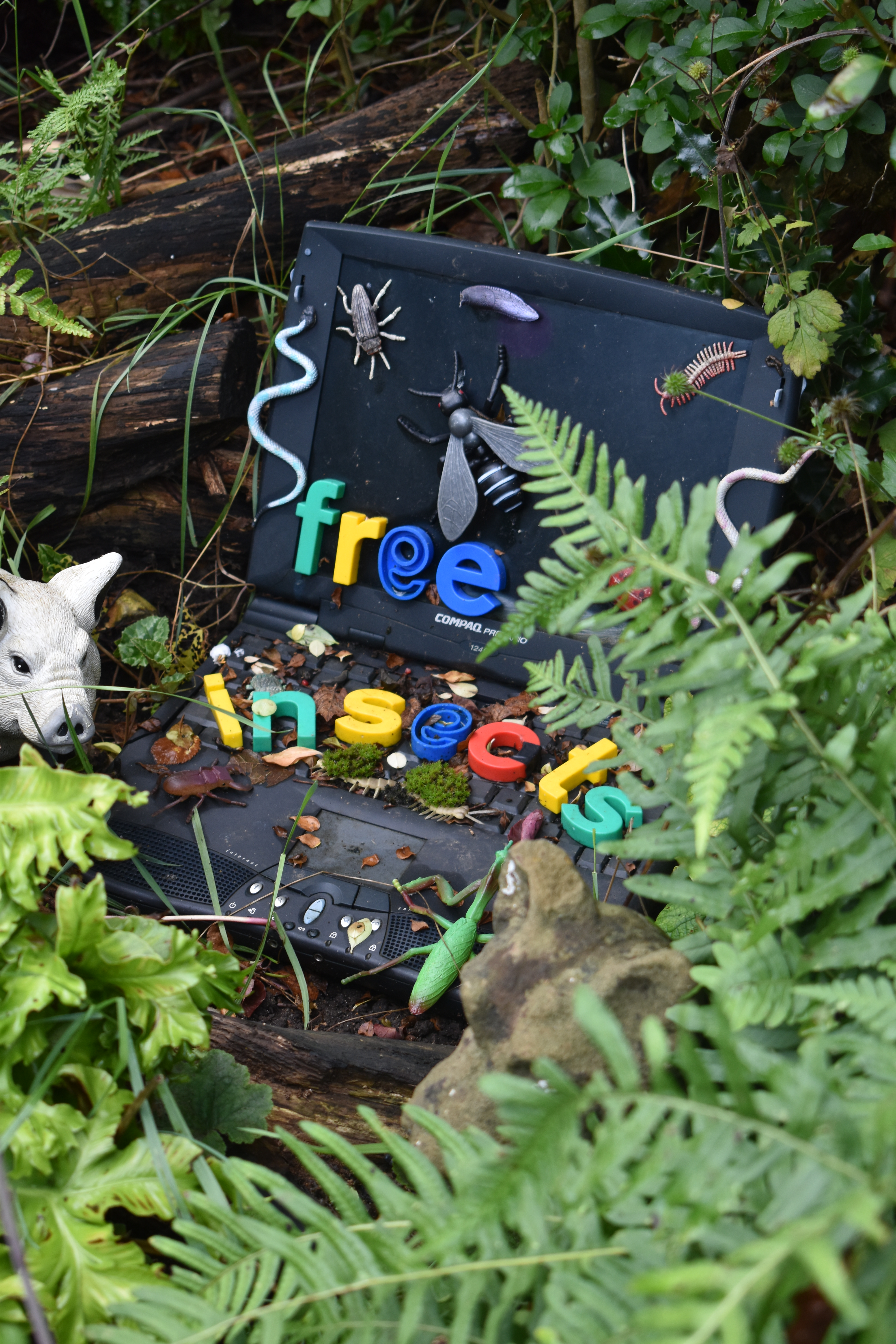A much smaller sculpture is a life sized wren which moves constantly on its gently moving bent metal stem allowing the wren to sway at our head height with the slightest breeze. He is very popular with our garden visitors. After rain he sports a water droplet right at the tip of his beak! Such a charmer!
