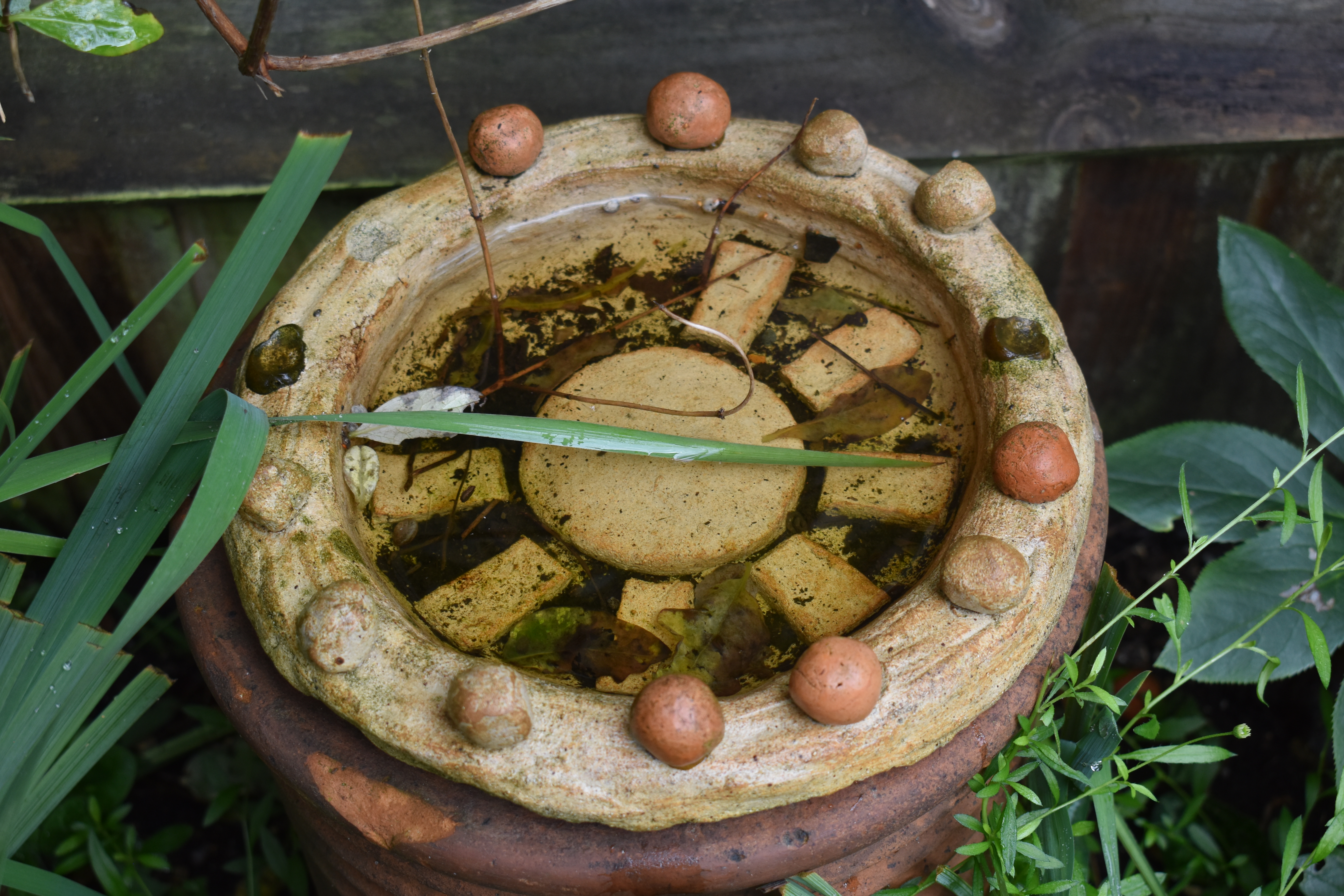 In the front garden in one of our ‘Doughnut’ beds we have a few pieces working together to enhance the planting.