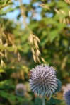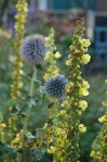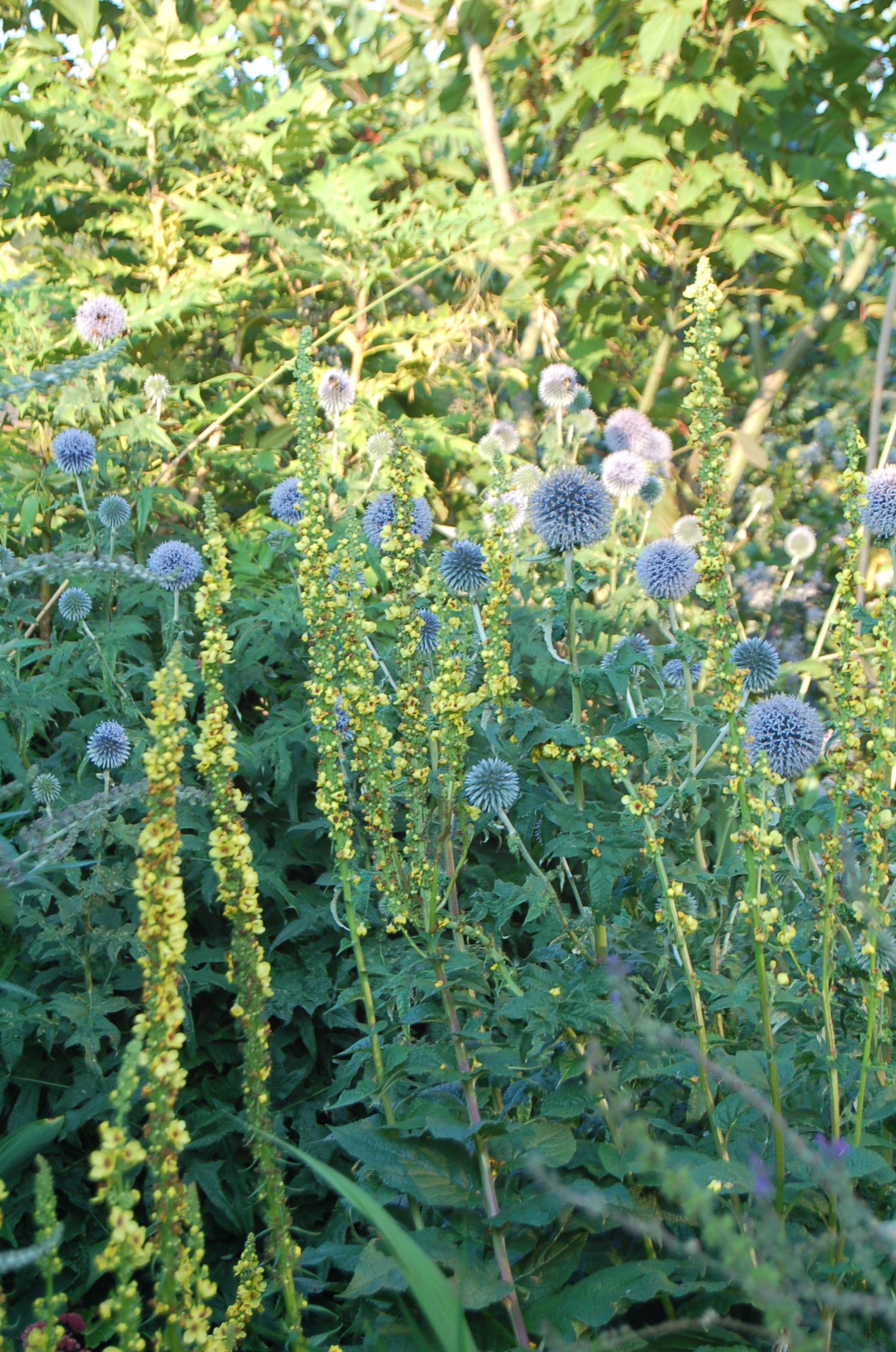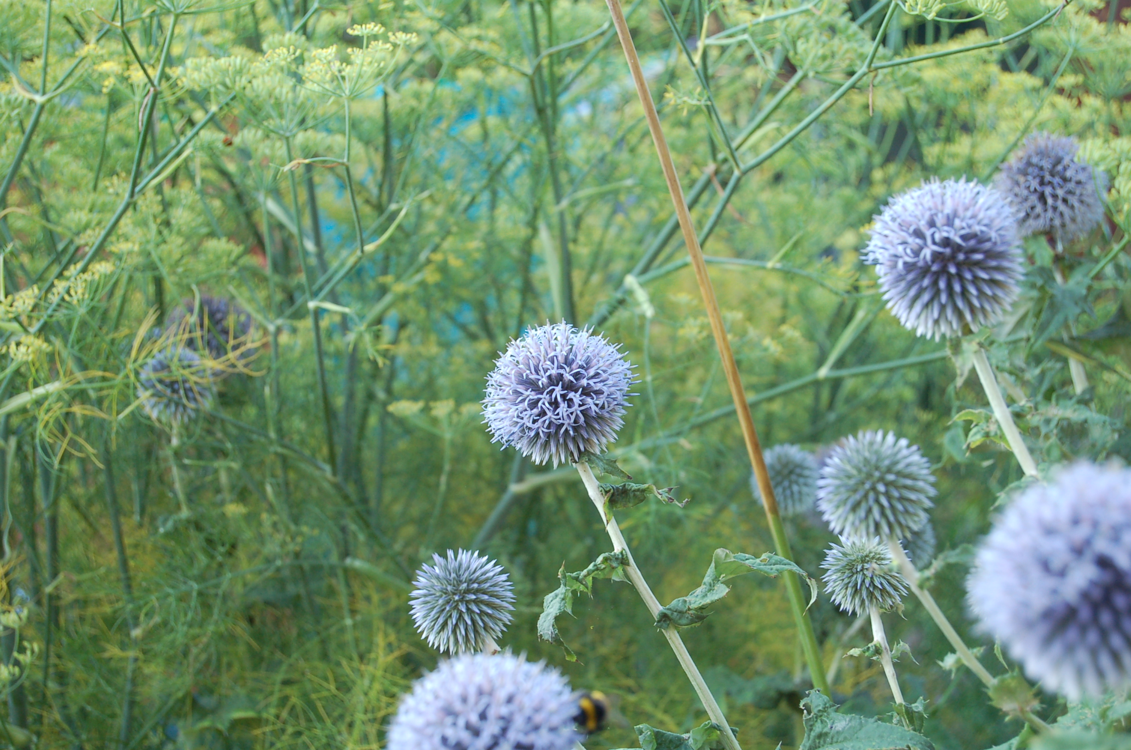 In the “Shed Bed” the delicate china blue flowers popping out of the spiky spheres of the echinops provide sustenance for our bees and the apple tree trained over an arch will provide sustenance for us. The odd white flowers come from the gentle creamy colours of the hydrangea heads.