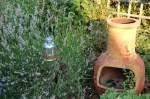 Our tulbagias continue to flower in the new slate garden close by and above them the purple sedum foliage hangs from the old gypsy kettle on our old ladder.