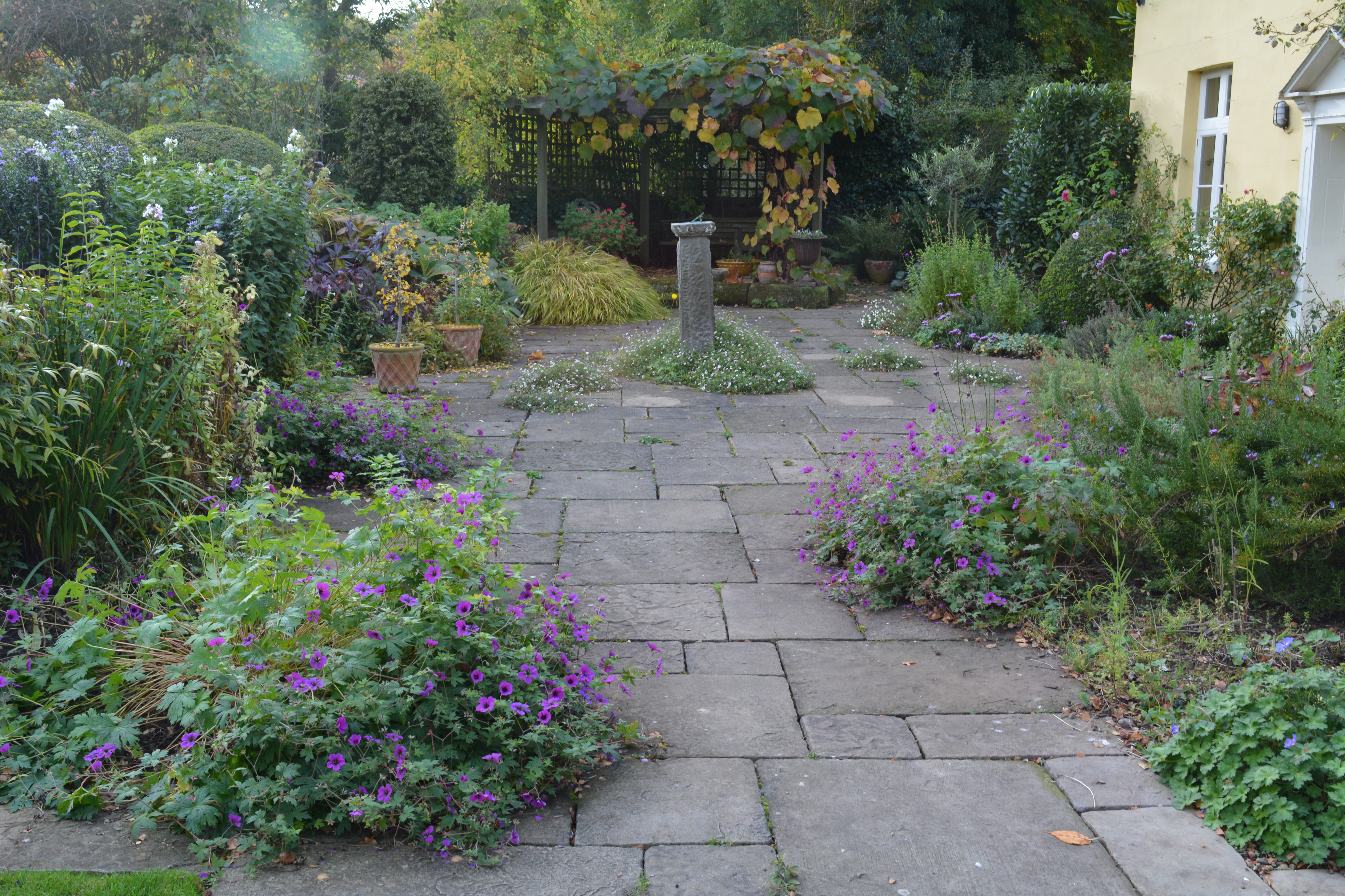 We walked along the flat of the valley bottom where the path felt much more level. We continued until we spotted a colourful patch of yellows and oranges partway up the valley side.