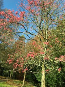 We have never been to an arboretum quite like this before. There is no big carpark, no impressive welcoming signage, no fancy visitor centre with comfortable restaurant. Instead we parked roadside on a area of gravel, a sail flag as a sign and after a few yards found a clearing in the trees with a shed acting as ticket office and cafe. This was not like any National Trust property we had visited before. Picnic benches were scattered in the clearing – all very rustic really but the area had its own charm. It didn’t matter being outside with our coffees because our visit was much earlier this year as you will tell by which shrubs are in flower. So we enjoyed a very good coffee while listening to birdsong as we waited for my brother Graham to arrive as he lived close by and had enjoyed his several previous visits here.