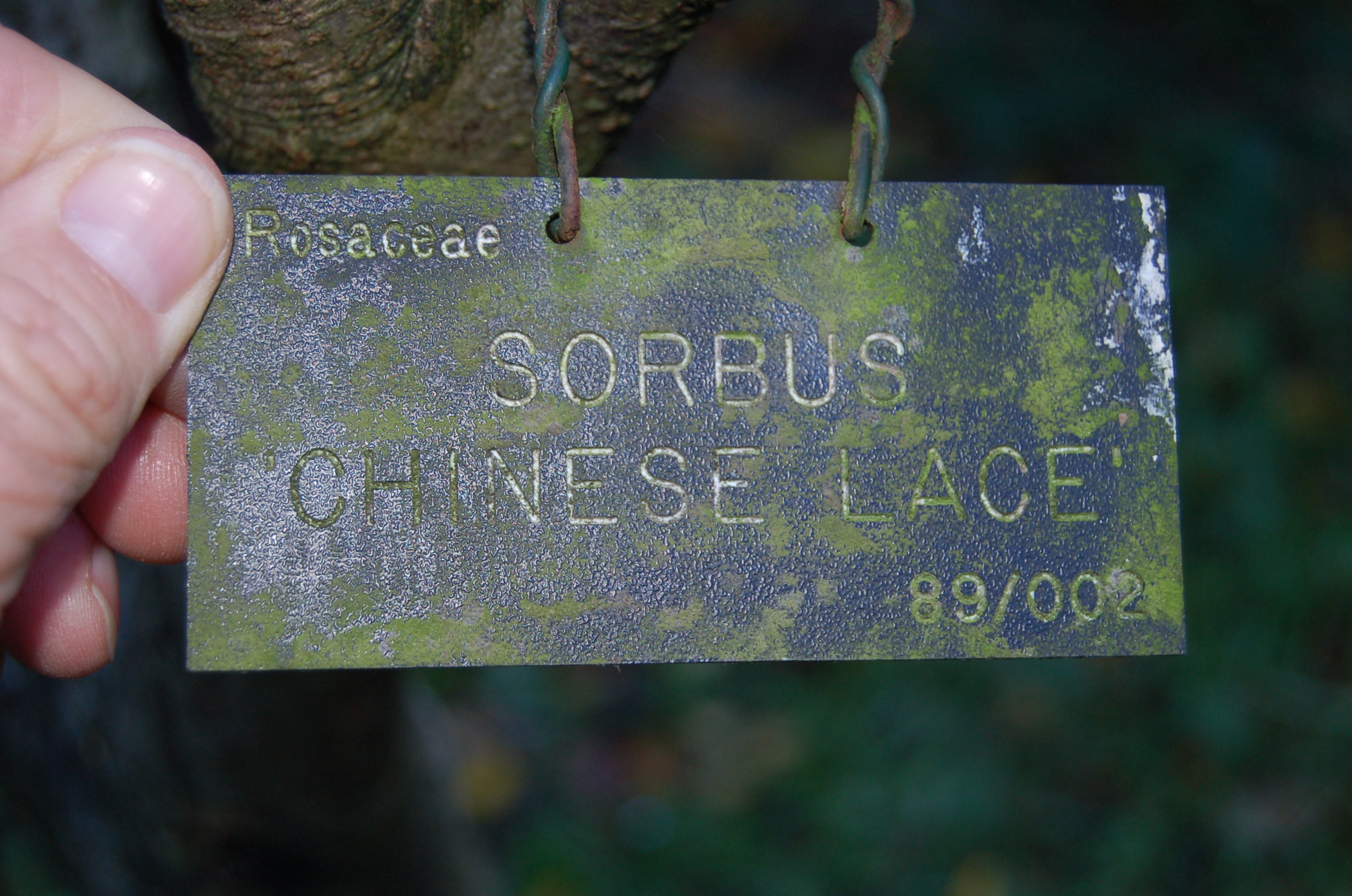 As we left the Oak Avenue behind and after we had enjoyed a quick look at the small Betula collection, we made our way slowly back to the car park. The sky began to get darker and drizzle began to fall. In the first shot included here you can see the bright autumn colours of the Birches through the line of huge pines. Many of them were small and still strongly guarded from the gnawing of the resident deer flock. I have also included a photo of one of the excellent, informative labels which is a great feature of this arboretum.