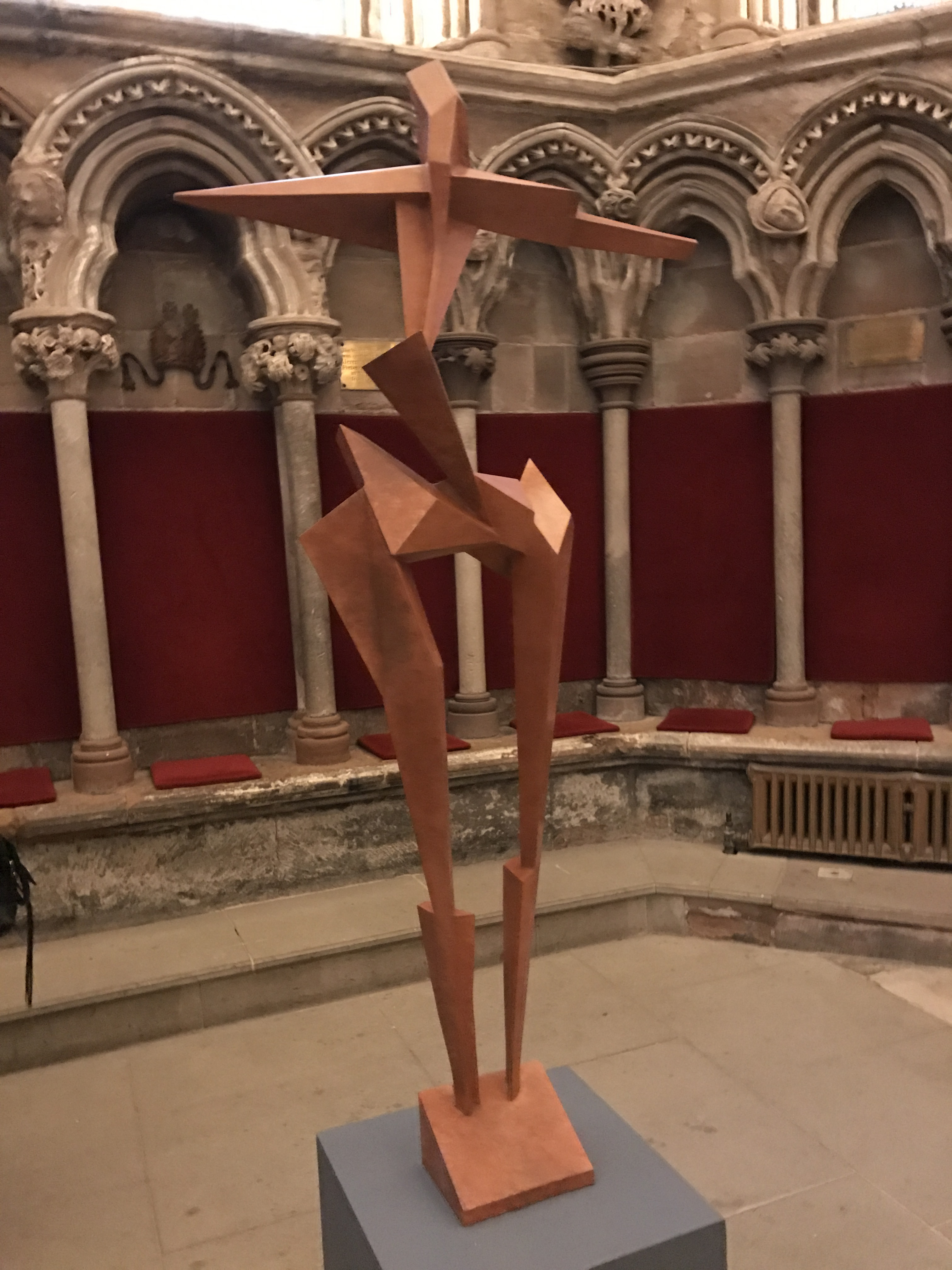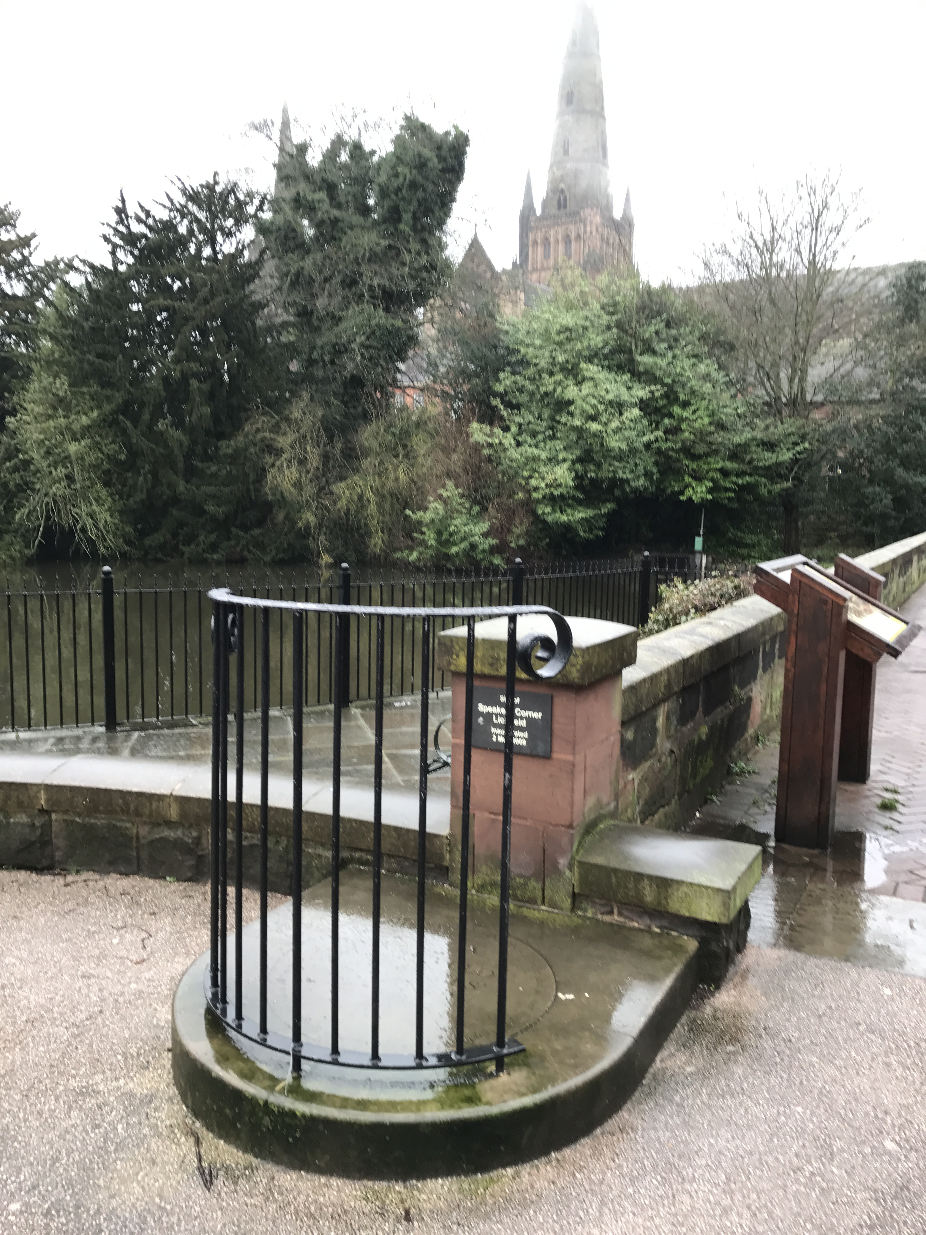 As we approached the cathedral green we found this “speakers’ corner” on the approach to the bridge. The cathedral was visible in the mist with its spire disappearing. There is sadly no place from which we could see its three spires.