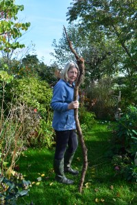 I wrote, “The re-development of the old hot garden continued to the end of the month and into the first days of November.” The first picture shows Jude the Undergardener holding up a huge root which Ian managed to dig out of the bed. He had to cut it off at both ends as it was extending beneath the lawn in one direction and out of our garden in another. It sat horizontally in the soil just above the boulder clay layer. We have no idea what plant it belonged to originally. One of our gardening mysteries! The second photo shows Ian our garden helper raking over the soil which he had meticulously double dug after adding lots of organic compost. This first addition of compost was dug in before a second batch was added as a thick mulch.