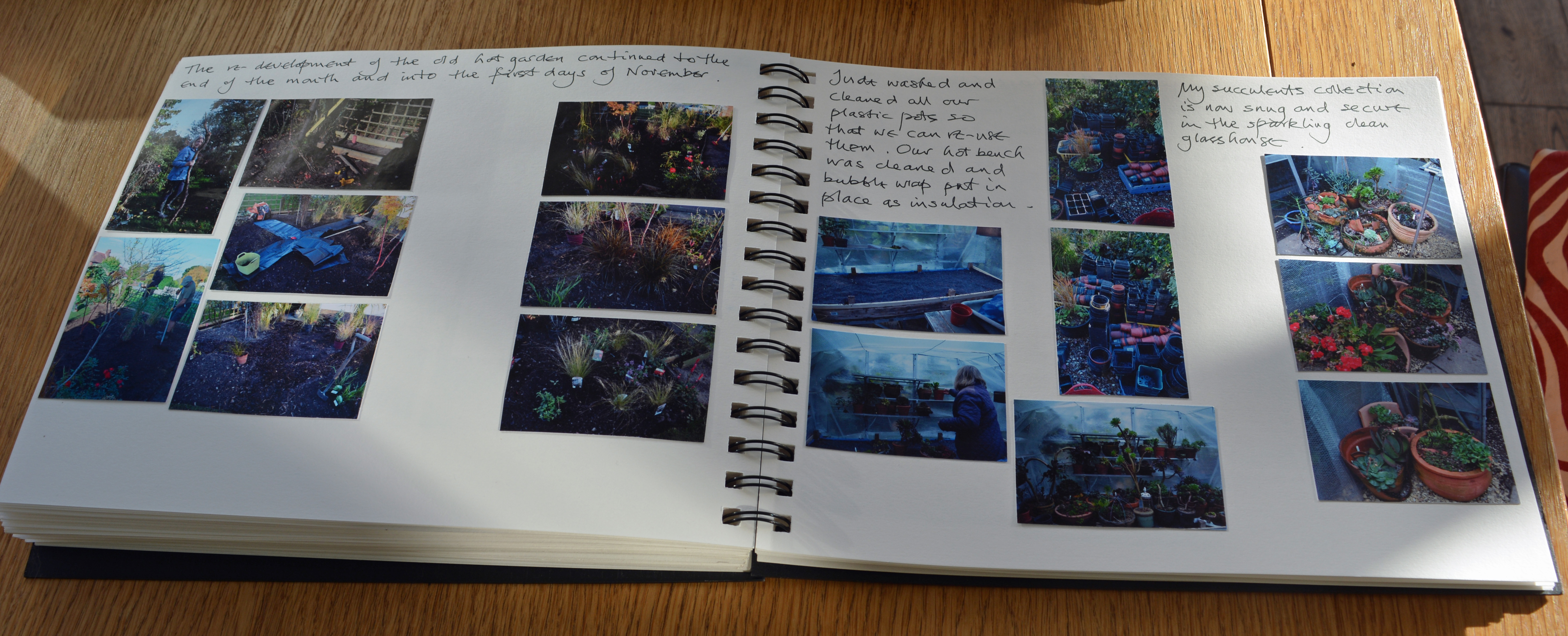 On the right hand page I looked at how Jude spent time early in the month cleaning pots, cleaning the glass in the greenhouse and putting up bubblewrap insulation. Once done this allowed us to move my succulent collection into the winter safety to be found under glass. “Jude washed and cleaned all our plastic pots so that we can reuse them. Our hot bench was cleaned up and bubblewrap put up in place as insulation. My succulent collection is now snug and secure in the sparkling clean greenhouse.”