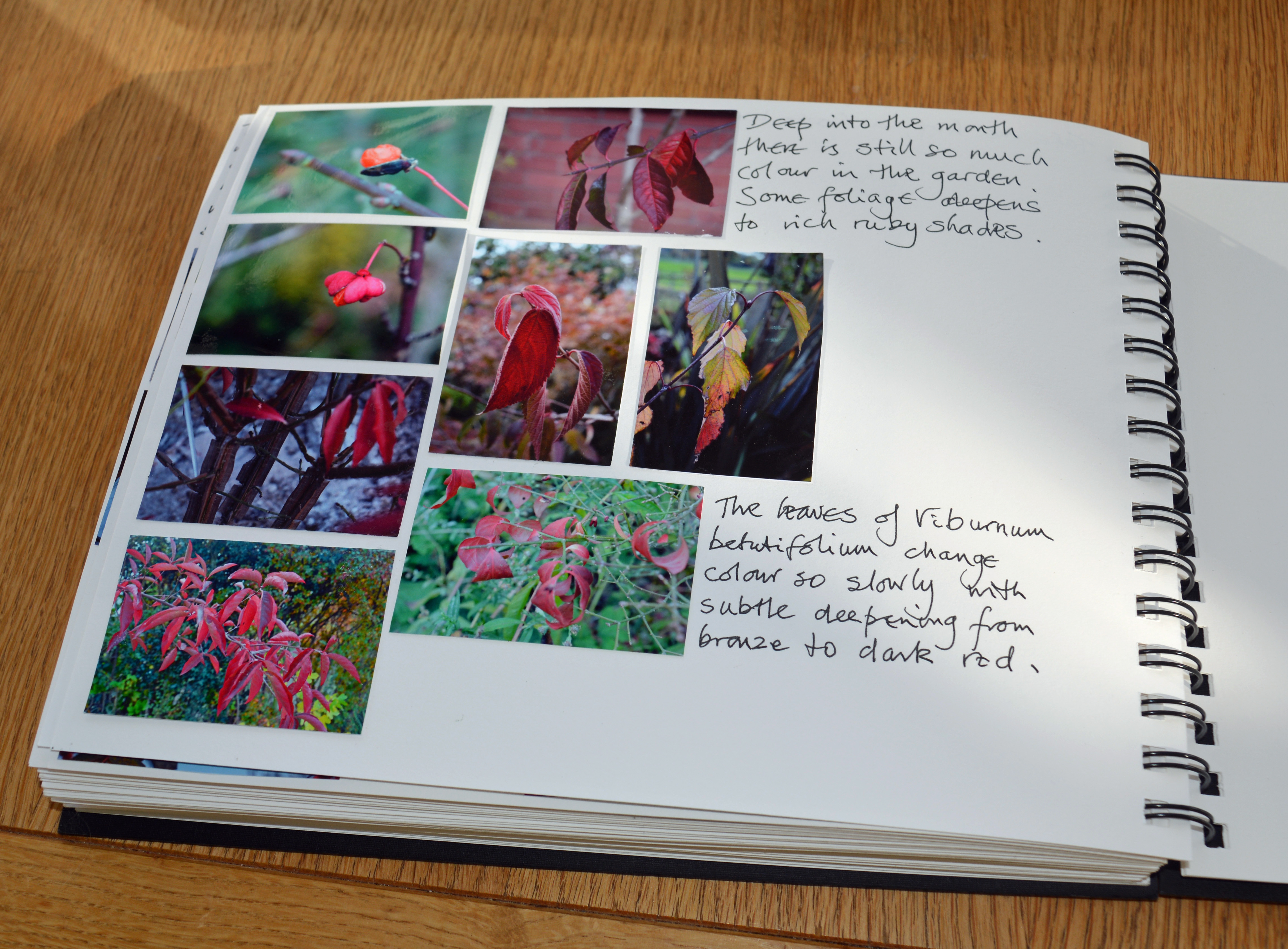 A set of eight photos display colours from our shrubs, and alongside I wrote, “Deep into the month there is still so much colour in the garden. Some foliage deepens to rich ruby shades.”