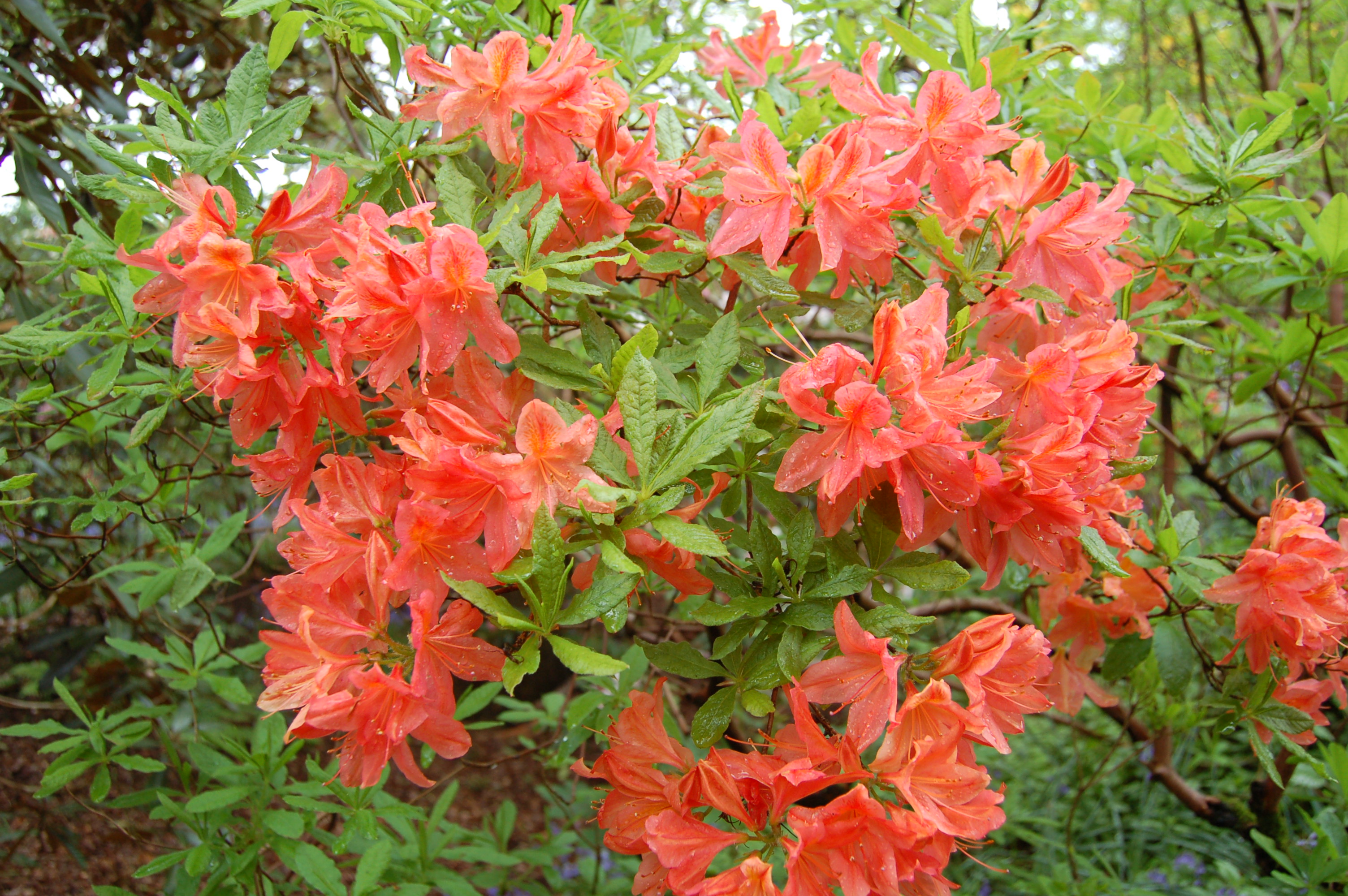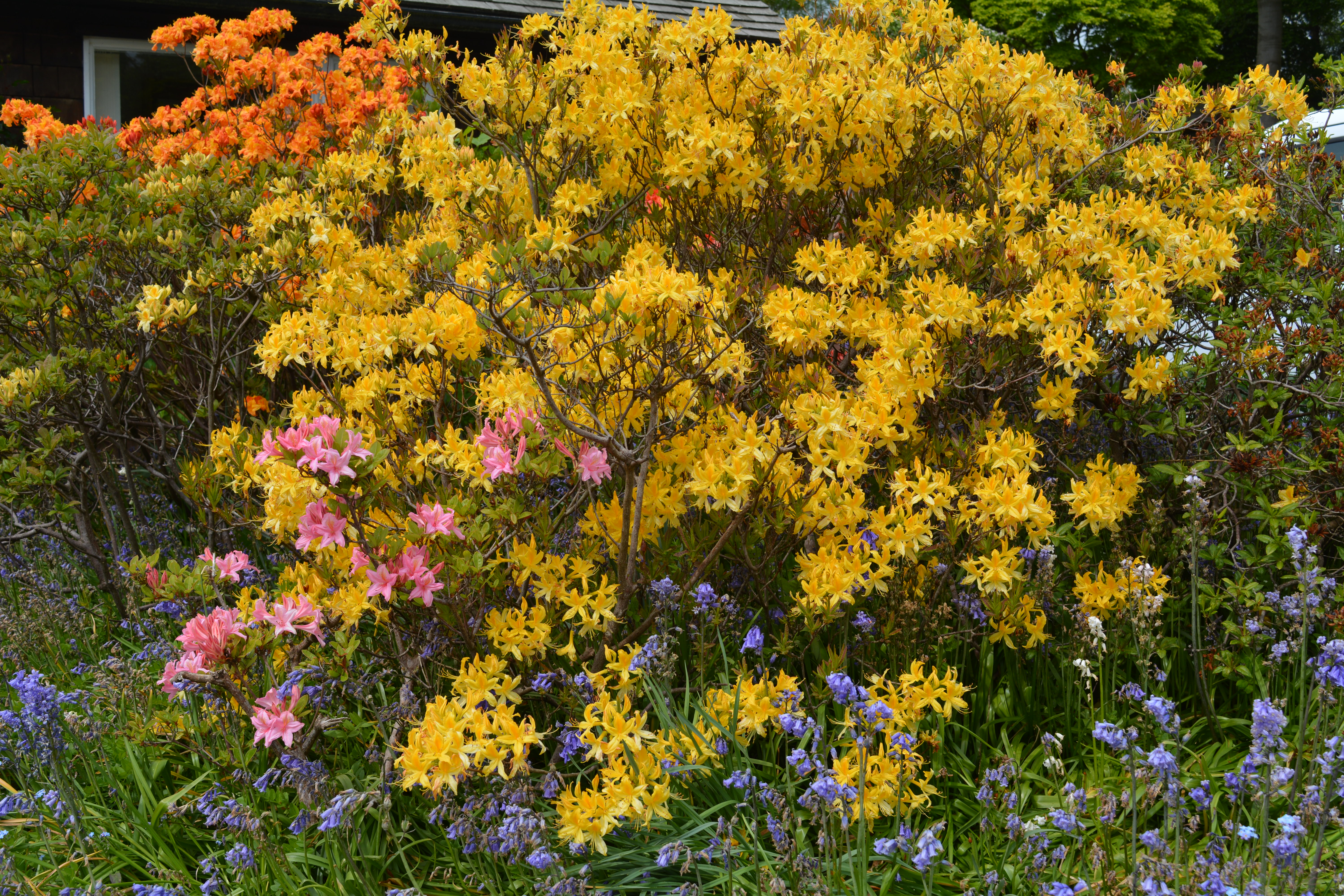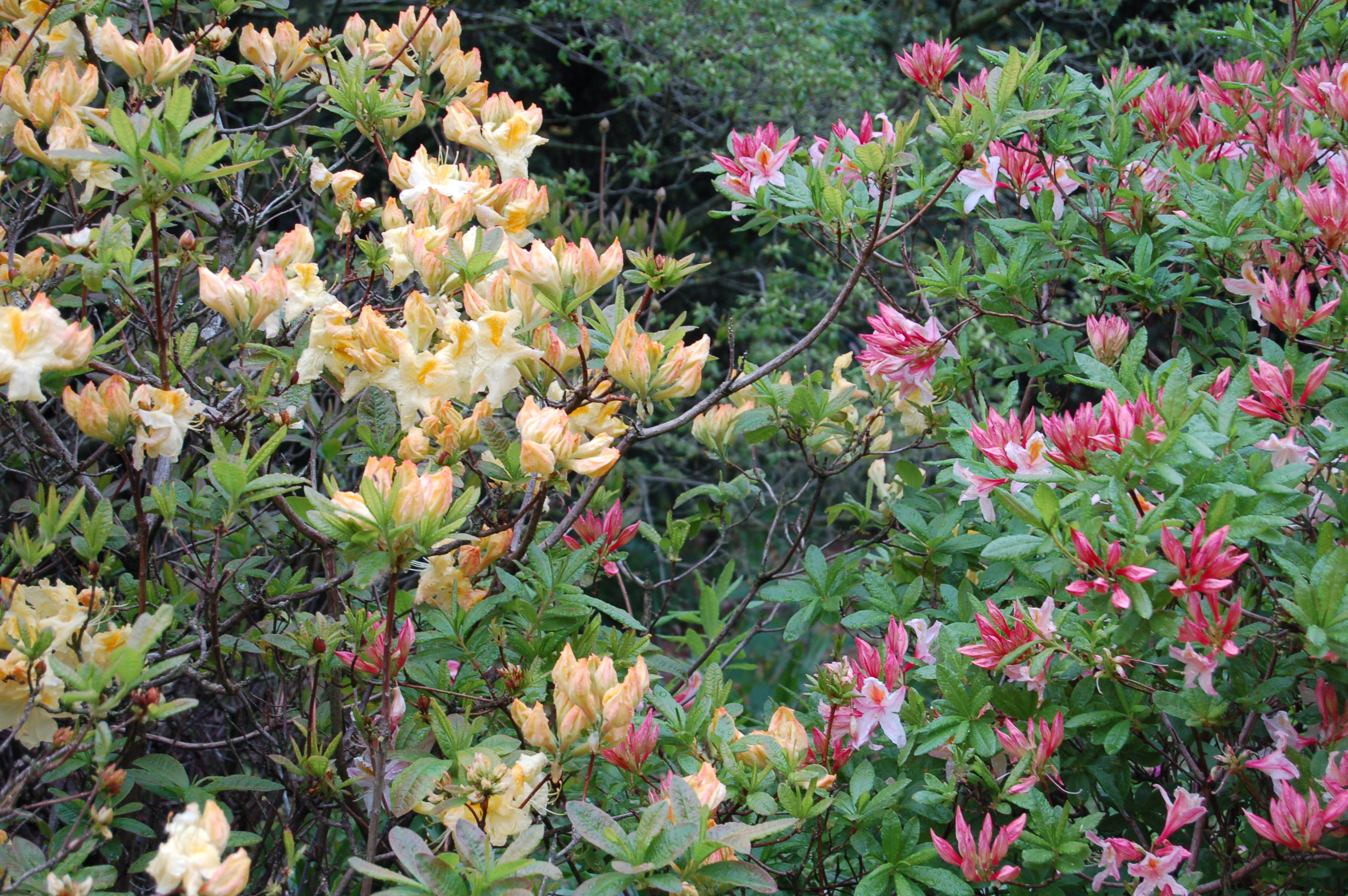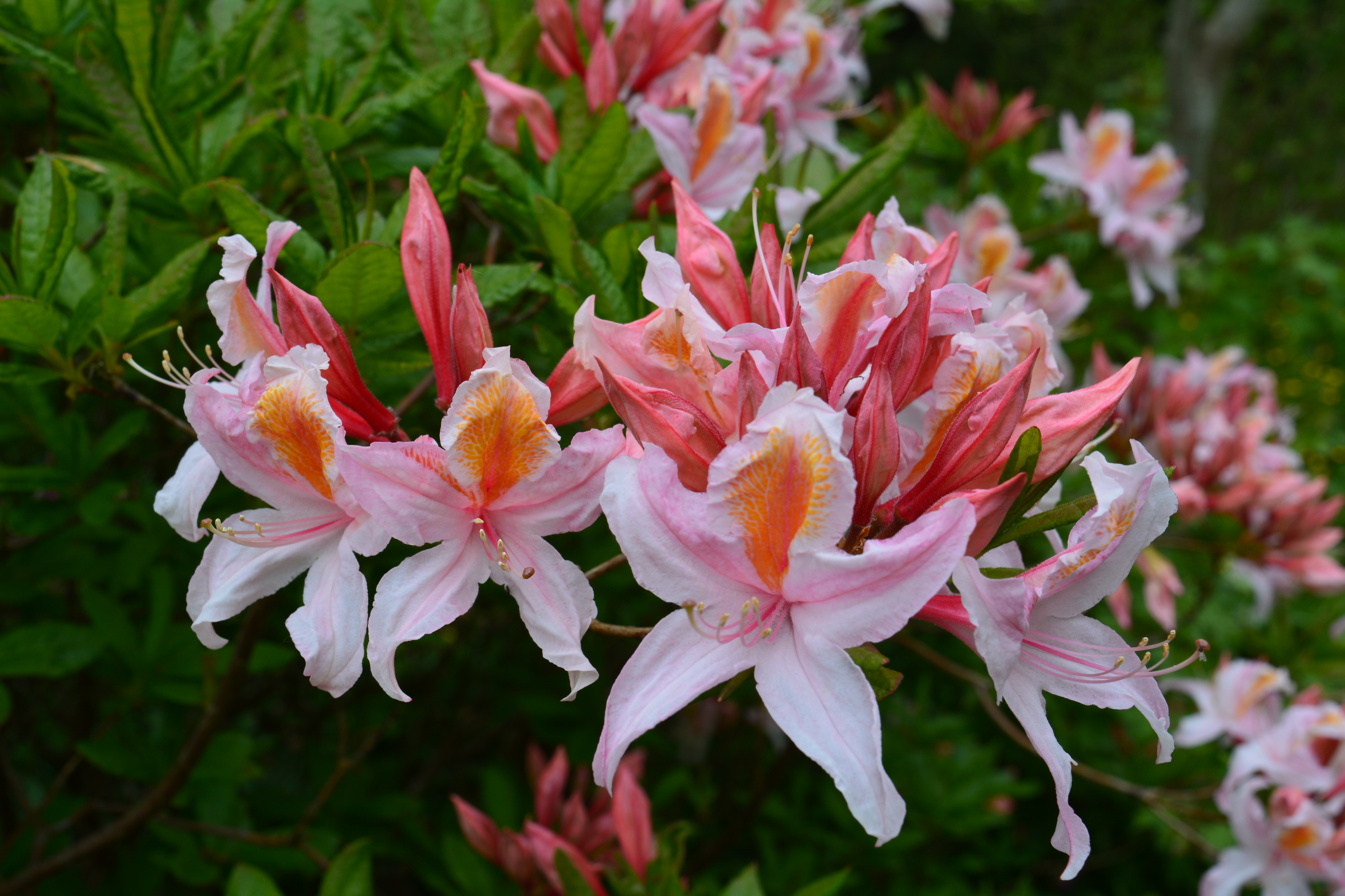 The brightest flowers were on this orange deciduous azalea. We like the deciduous varieties far more than the evergreens and grow a few in our own garden.