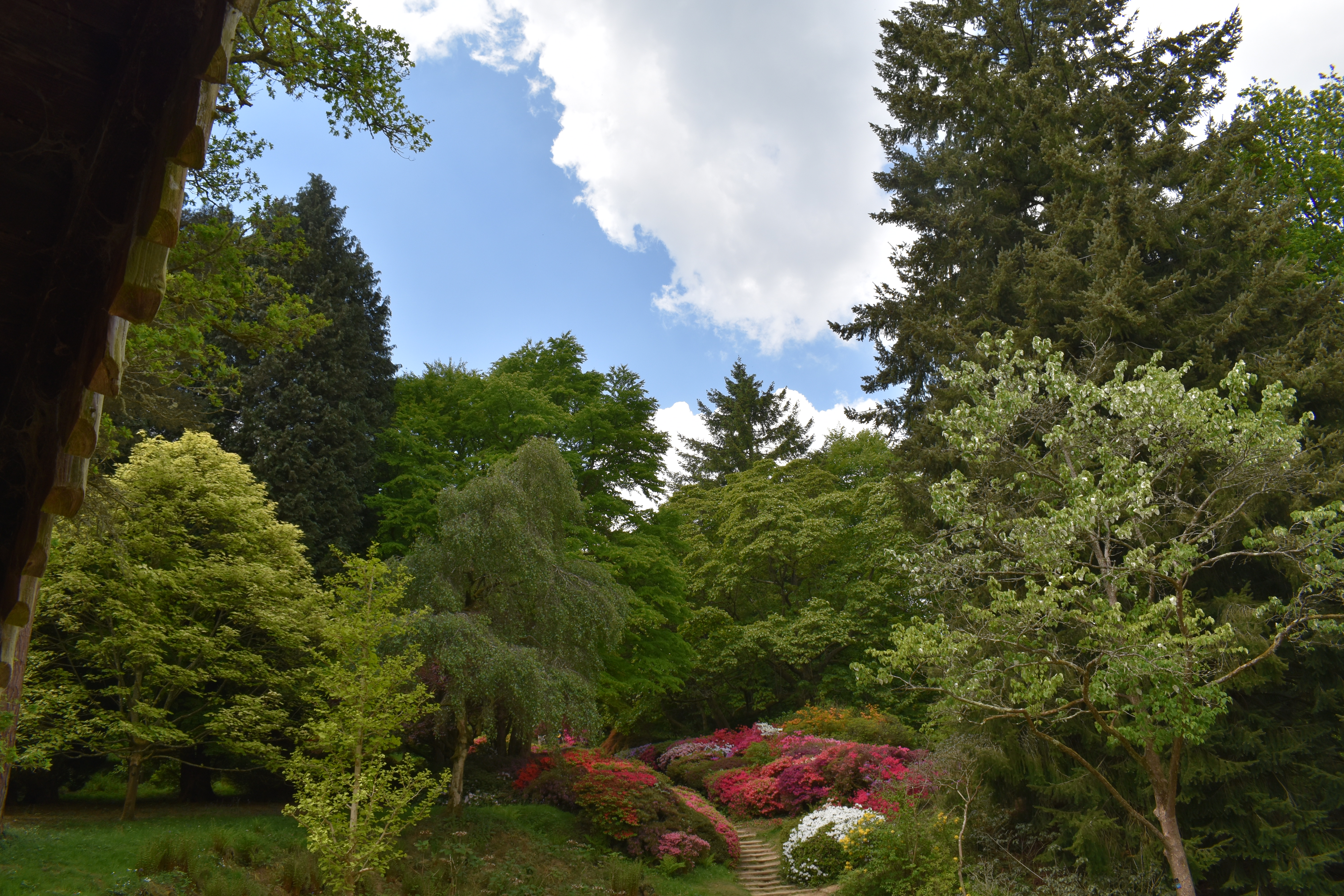 We have never been to an arboretum quite like this before. There is no big carpark, no impressive welcoming signage, no fancy visitor centre with comfortable restaurant. Instead we parked roadside on a area of gravel, a sail flag as a sign and after a few yards found a clearing in the trees with a shed acting as ticket office and cafe. This was not like any National Trust property we had visited before. Picnic benches were scattered in the clearing – all very rustic really but the area had its own charm. It didn’t matter being outside with our coffees because our visit was much earlier this year as you will tell by which shrubs are in flower. So we enjoyed a very good coffee while listening to birdsong as we waited for my brother Graham to arrive as he lived close by and had enjoyed his several previous visits here.