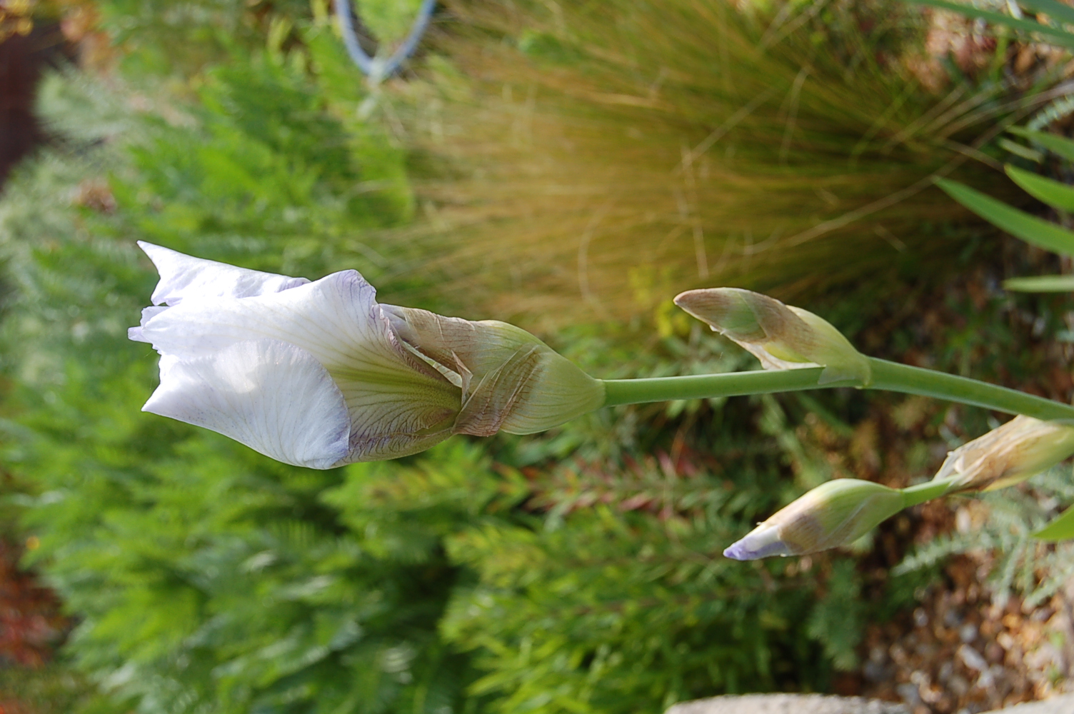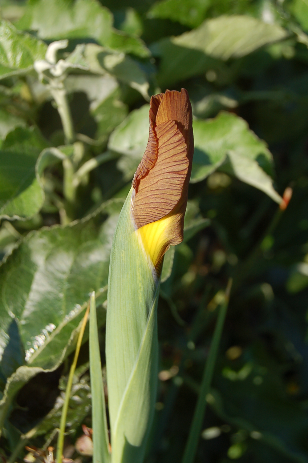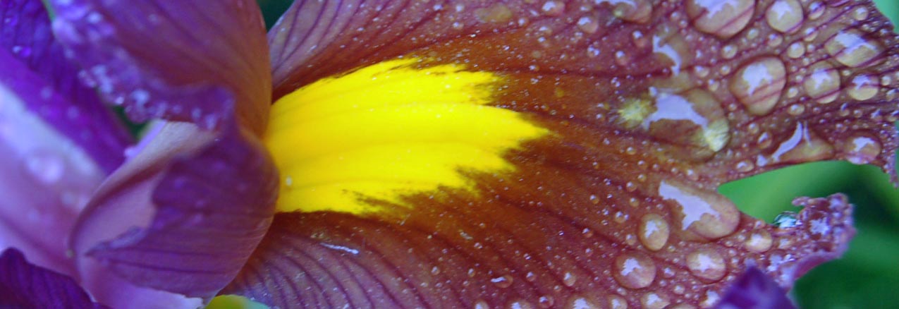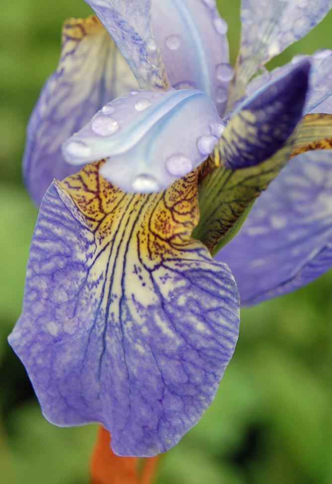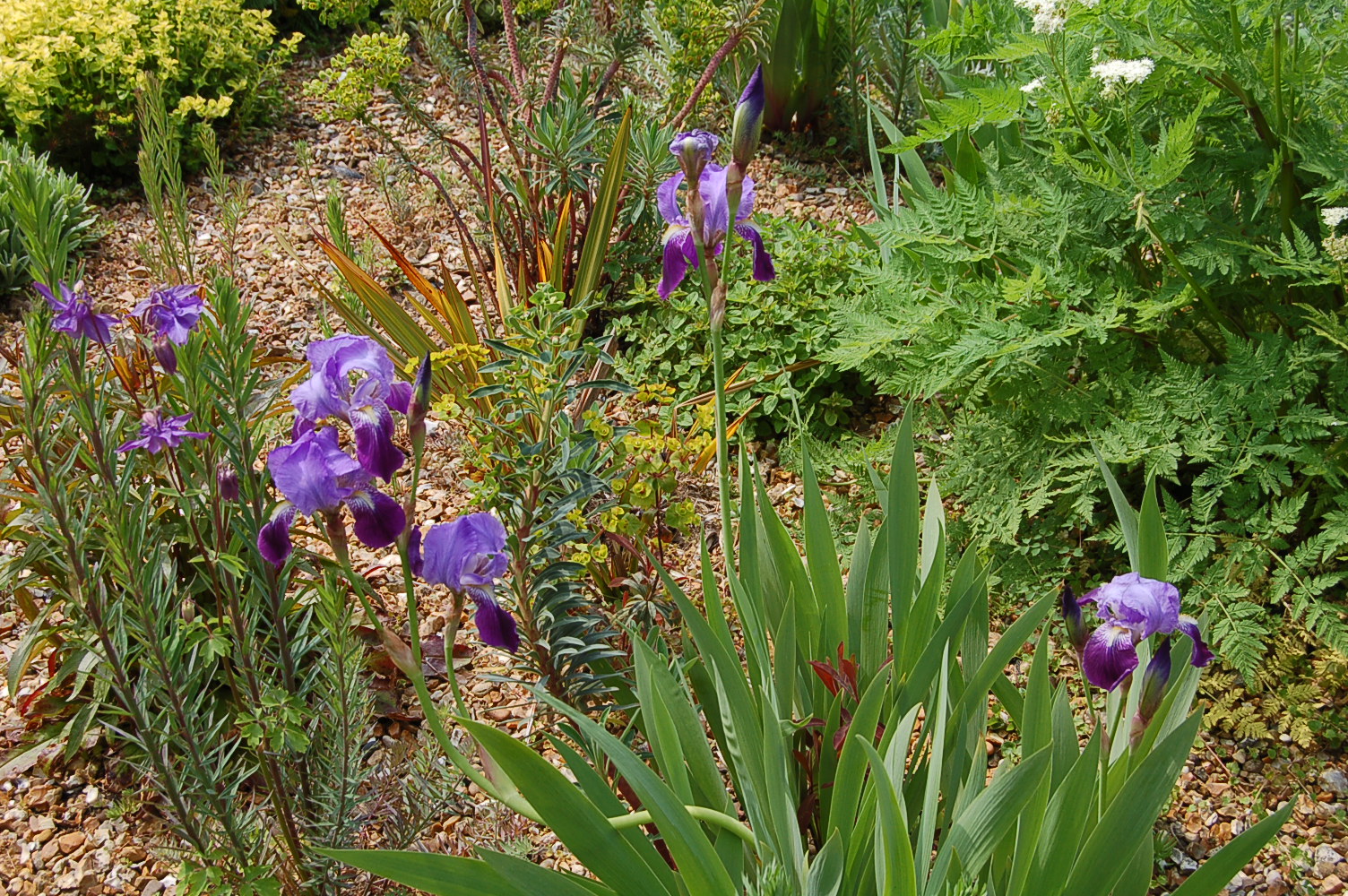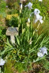 The iris family have the most unusually structured flowers in our garden, with their flags, falls and landing strips for bees.”
