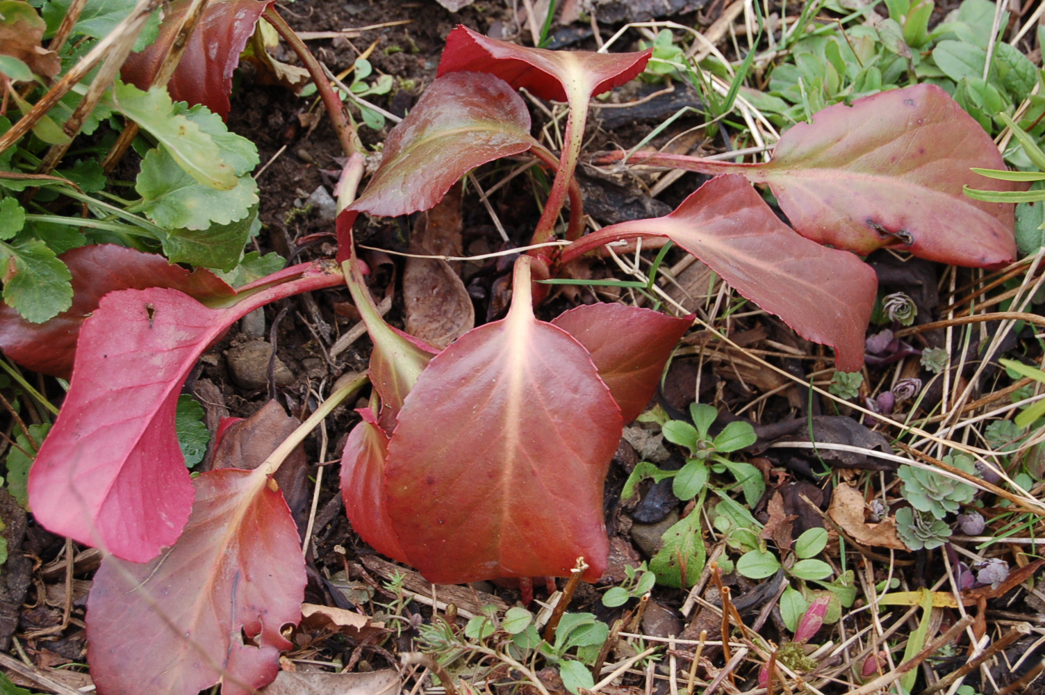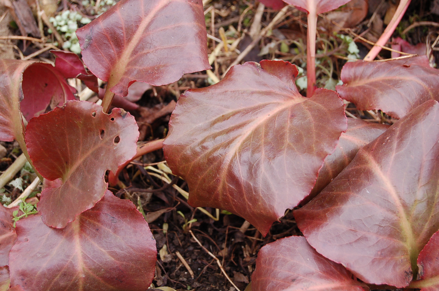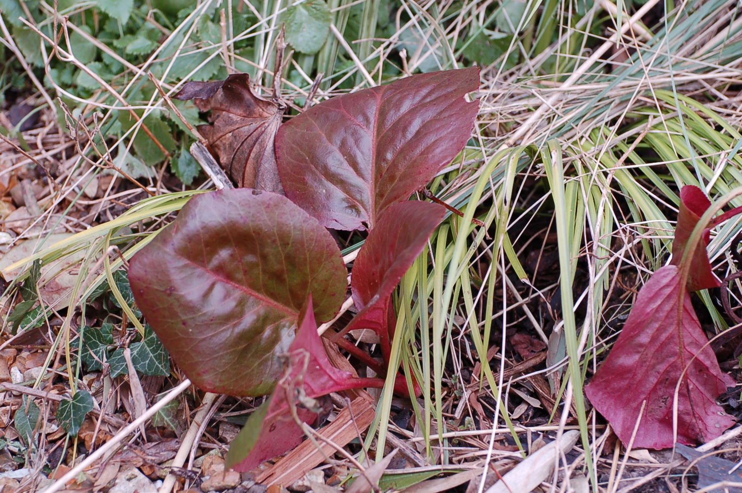 I wrote, “An unknown plant and an under appreciated plant, both stalwarts of the March garden, Bergenias and Drimys. I love them both!”