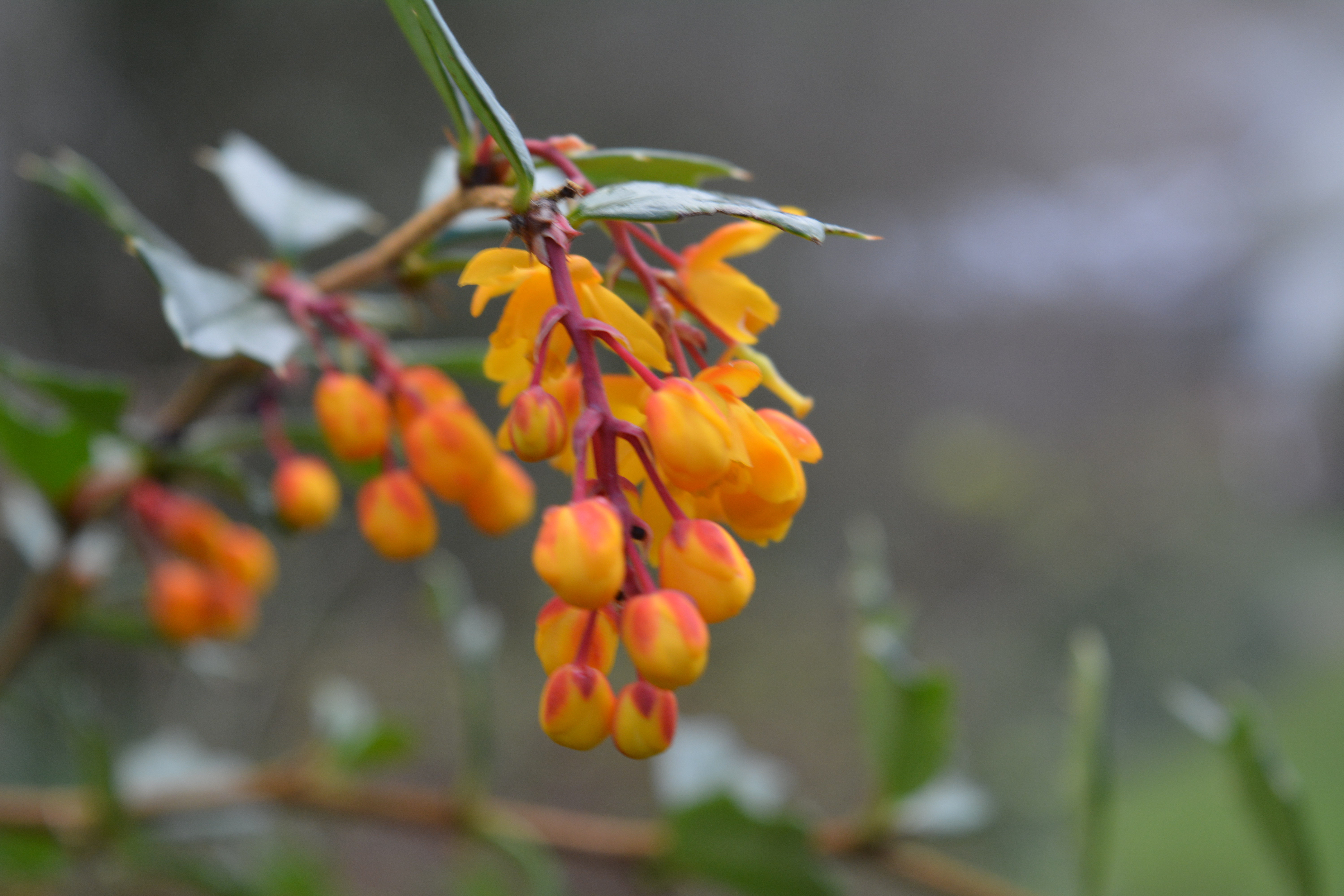 As we spotted the gate which would end our exciting visit we were drawn to bright orange blooms on a shrub in the distance. Once we got closer we knew it had to be a Berberis and we were right. It looked luminous in the dull afternoon light. A delicate pale pink Geranium close by was much harder to find.