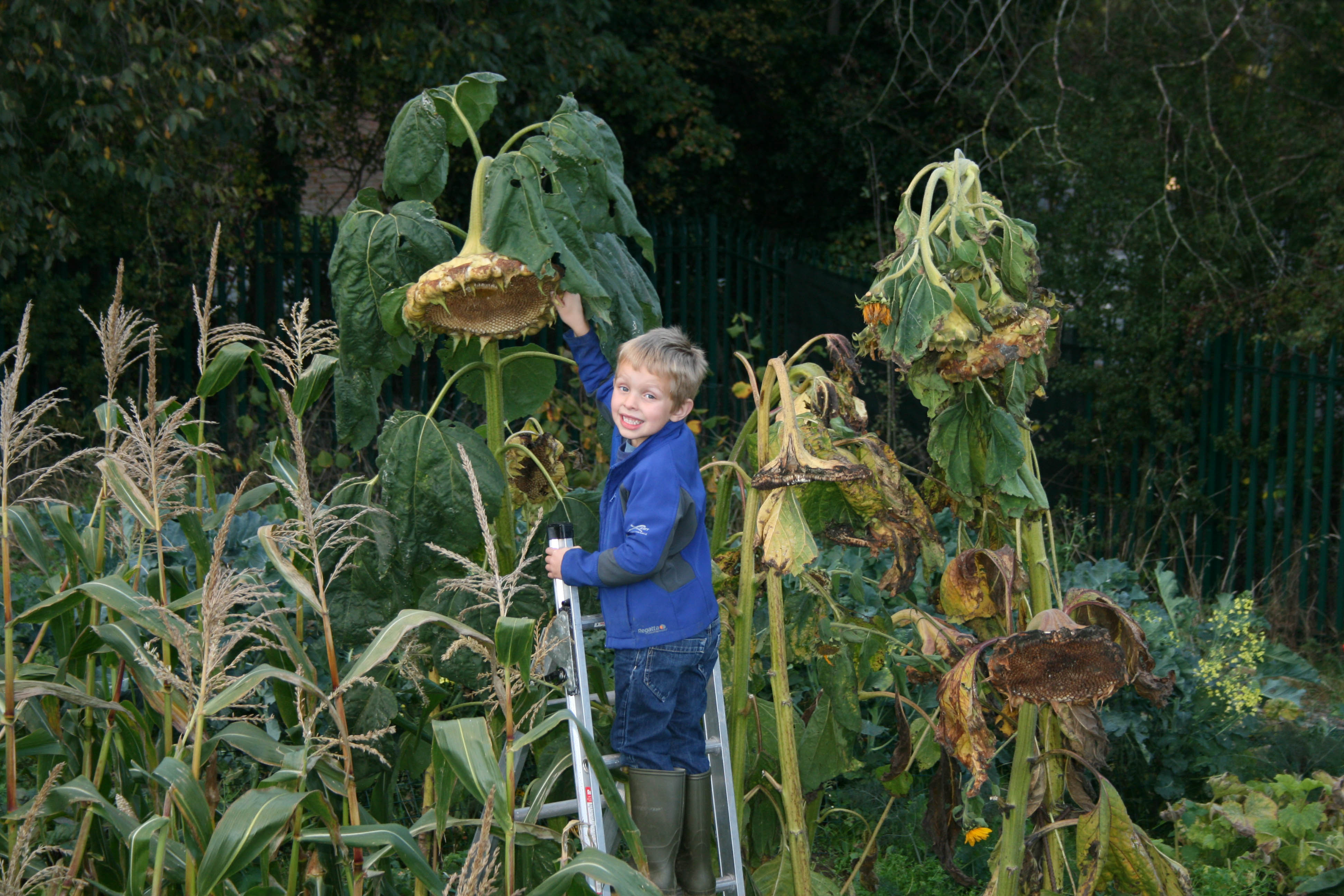It is early autumn and we have just finished three crazy days on our allotment site, Bowbrook Allotment Community. Three very exciting days. It all began with measuring sunflowers for our annual Sunflower Competition where we determine which child and which adult has grown the tallest plant and the biggest flower. Just like last year the children showed the adults up when it came to growing giant sunflowers. For Little Henry here it was quite an effort to inspect his flowers. His plants outshone all others, children’s and adult’s alike, with the tallest plant towering to almost 3 metres and the width of his largest flower head measuring 33cm. We definitely have a gardener of the future here!
