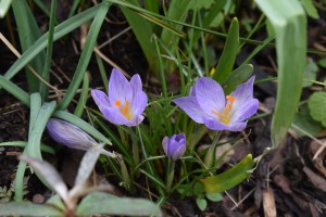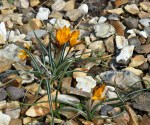 “Other early flowering plants giving bright spots in our borders include Crocus and Pulmonaria. This golden Crocus has a bright green Pittosporum as its partner. The pink Pulmonaria is partnering a fern and an Arum, A. italicum “Marmoratum”.