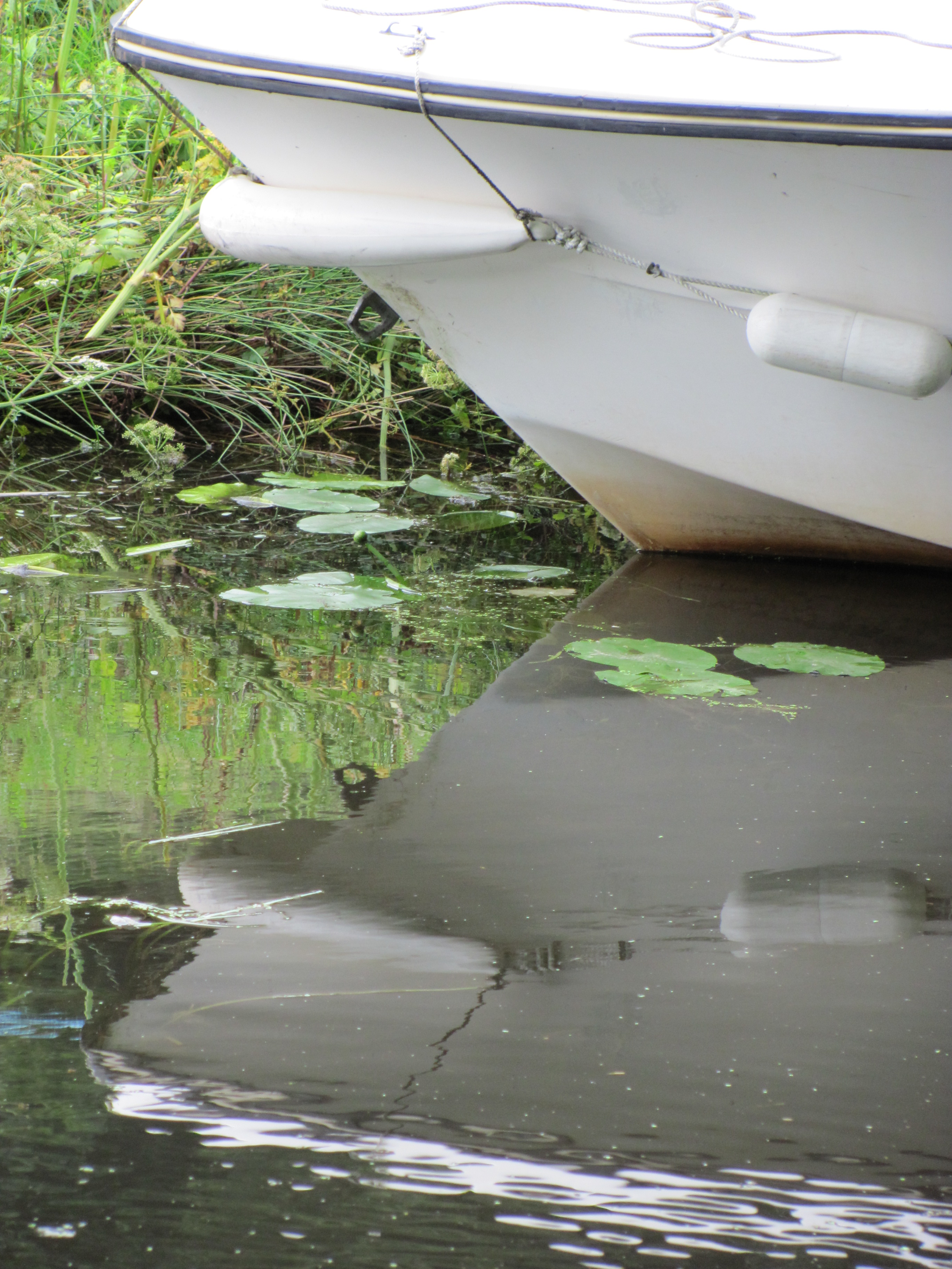 As we walked, on the light changed and the canal surface reflected the bankside vegetation, the boats moored up against its side and the canal structures.