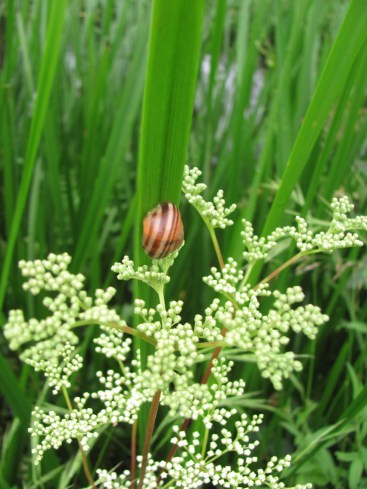 These little banded snails with their glossy coloured shells decorated with chocolate or black bands which followed the spiralling shape of their shell homes, began to appear after the shower of rain.