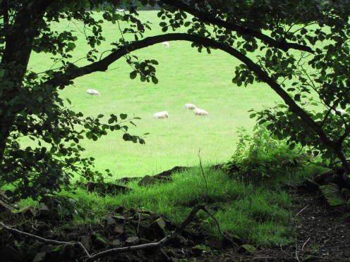 From our coffee-drinking, gate-leaning vantage point we  watched sheep grazing on the field beyond the far-bank trees and spotted a long, low red-bricked barn half way up the sloping field.