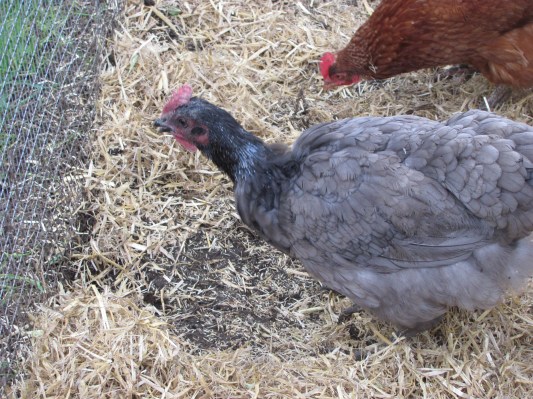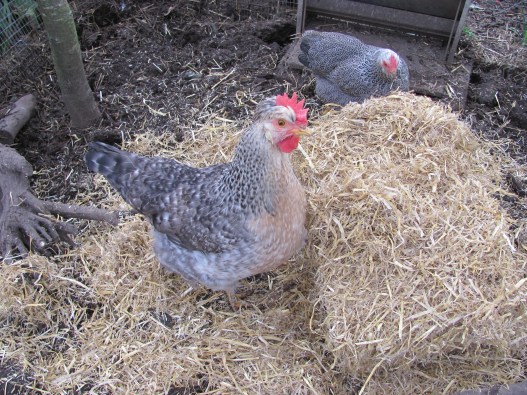 This scraggy bird is “Bluebell”, a Bluebelle Hybrid, who has rather unwisely decided that January is the right time to moult! She is usually a stunning looking hen with lots of shades of bluish grey feathers with a contrasting ginger-bronze breast.