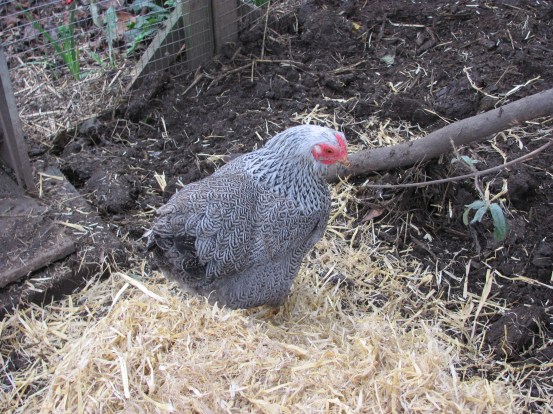The next photo is of “Royella” our remaining Silver Laced Wyandotte Bantam from our original pair, who were named Val and Royella after our next door neighbours, Roy and Valerie because their foliage was the same colour as our neighbours hair!
