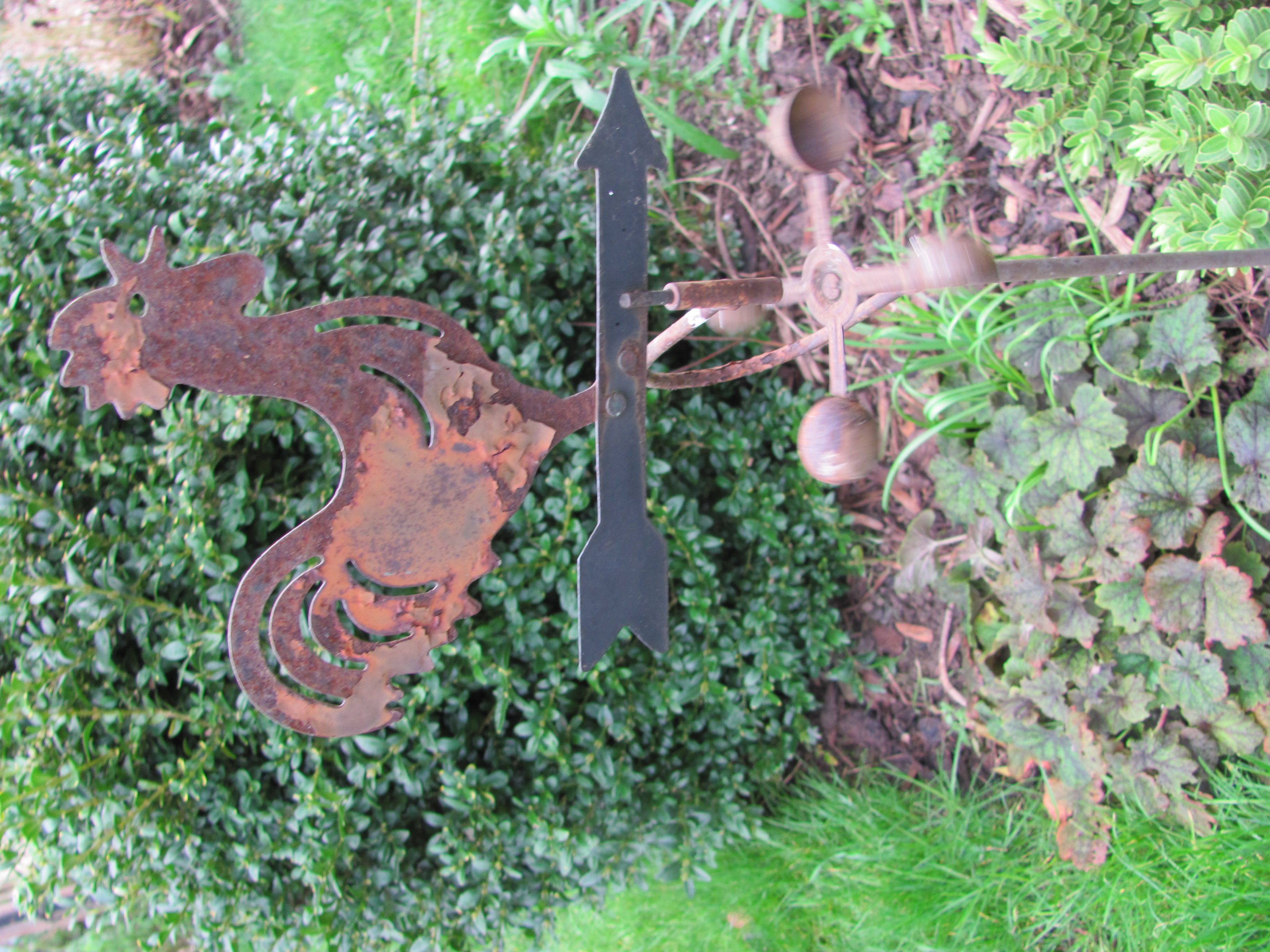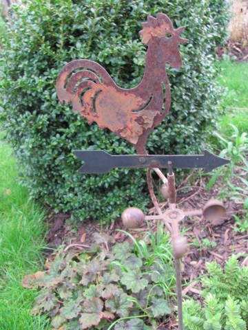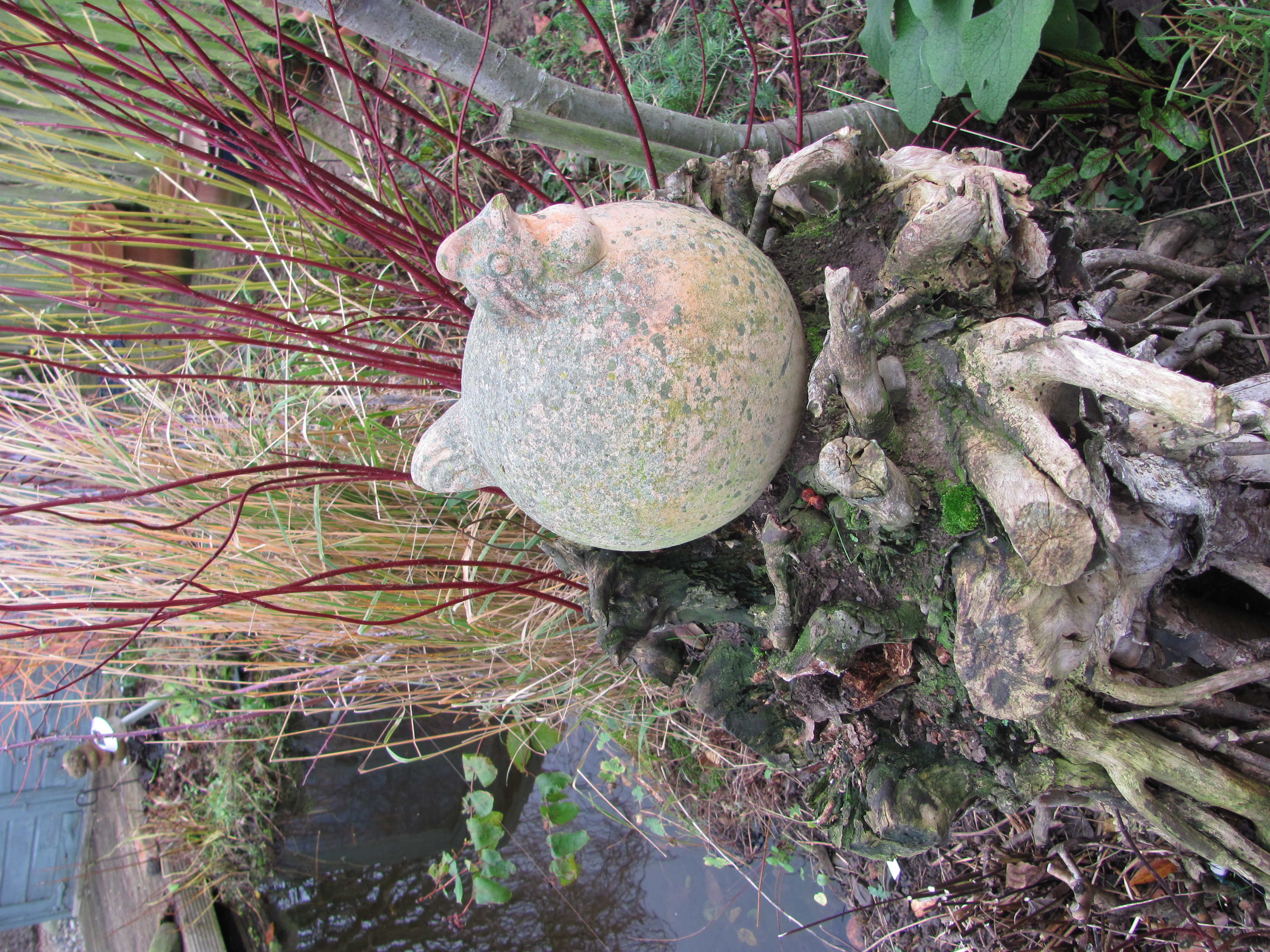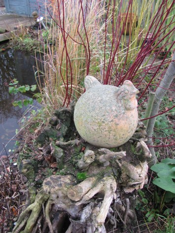 The easiest hens to photograph are the ornaments in the garden, such as this very round terra-cotta version sat on an old hazel stump on the poolside with a backdrop of grasses and dogwoods ………