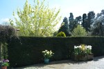 Snowdrops in drifts light up the ground beneath the tree. Ilex “Ferox” sparkles with variegated leaves curled and heavily spined, probably one of the best hollies available for the small garden.