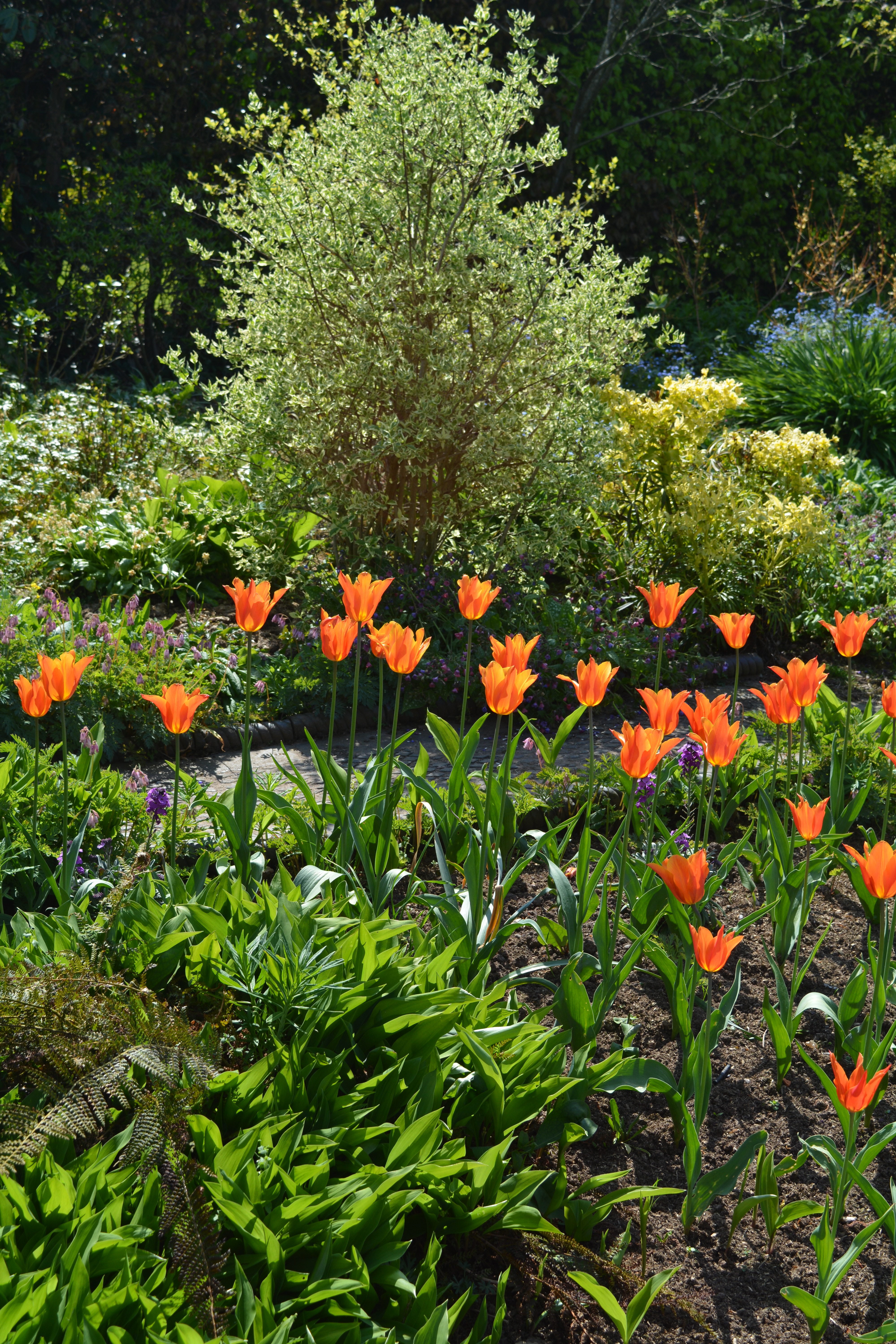 Snowdrops in drifts light up the ground beneath the tree. Ilex “Ferox” sparkles with variegated leaves curled and heavily spined, probably one of the best hollies available for the small garden.