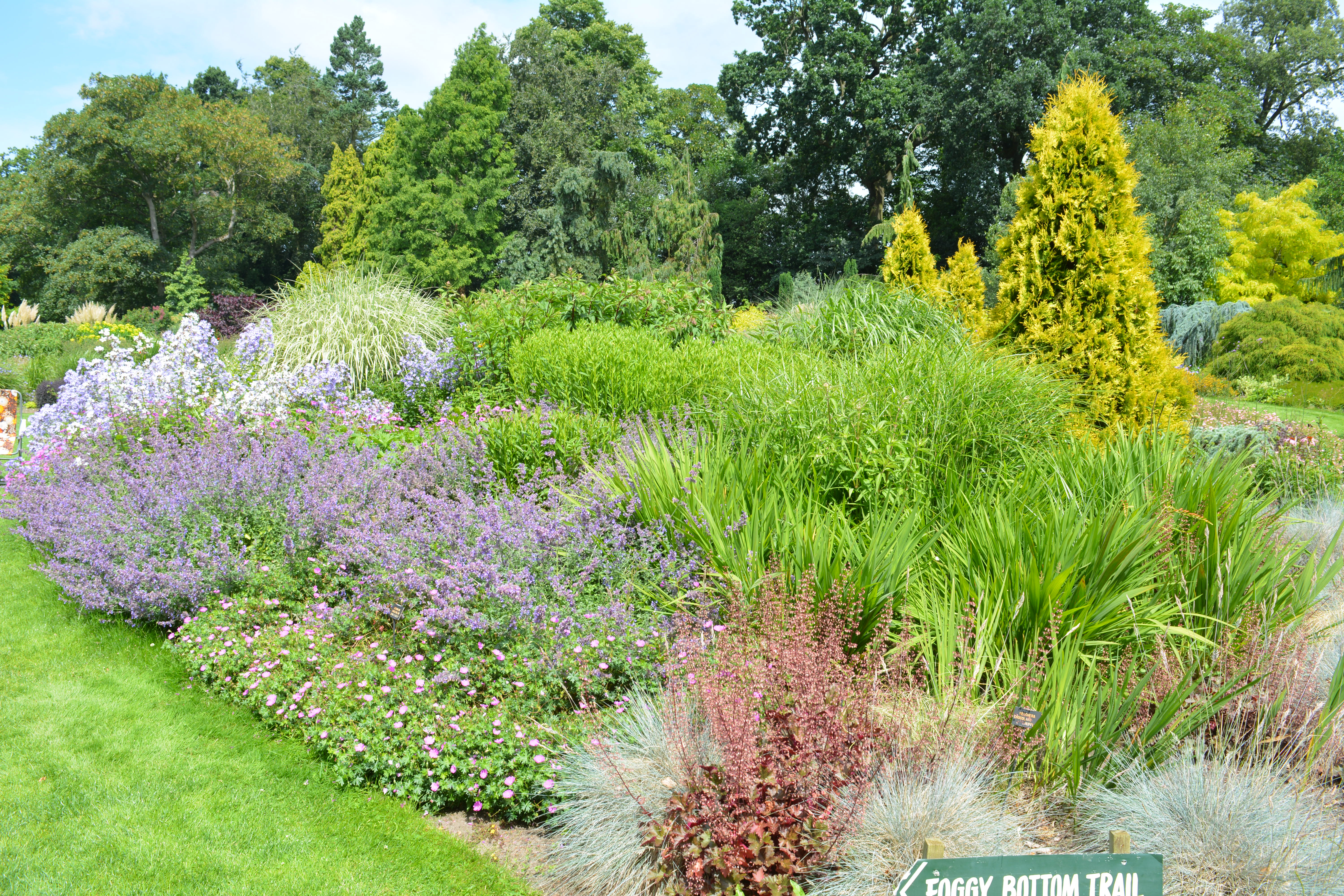 Conifers, grasses and trees and shrubs with coloured stems and bark give a common theme throughout. The first two photos below show the matching gold coloured foliage of a group of conifers and a swathe of grasses.