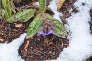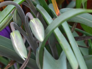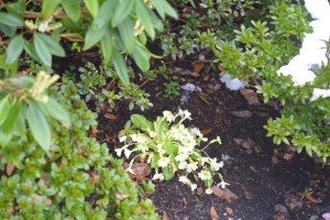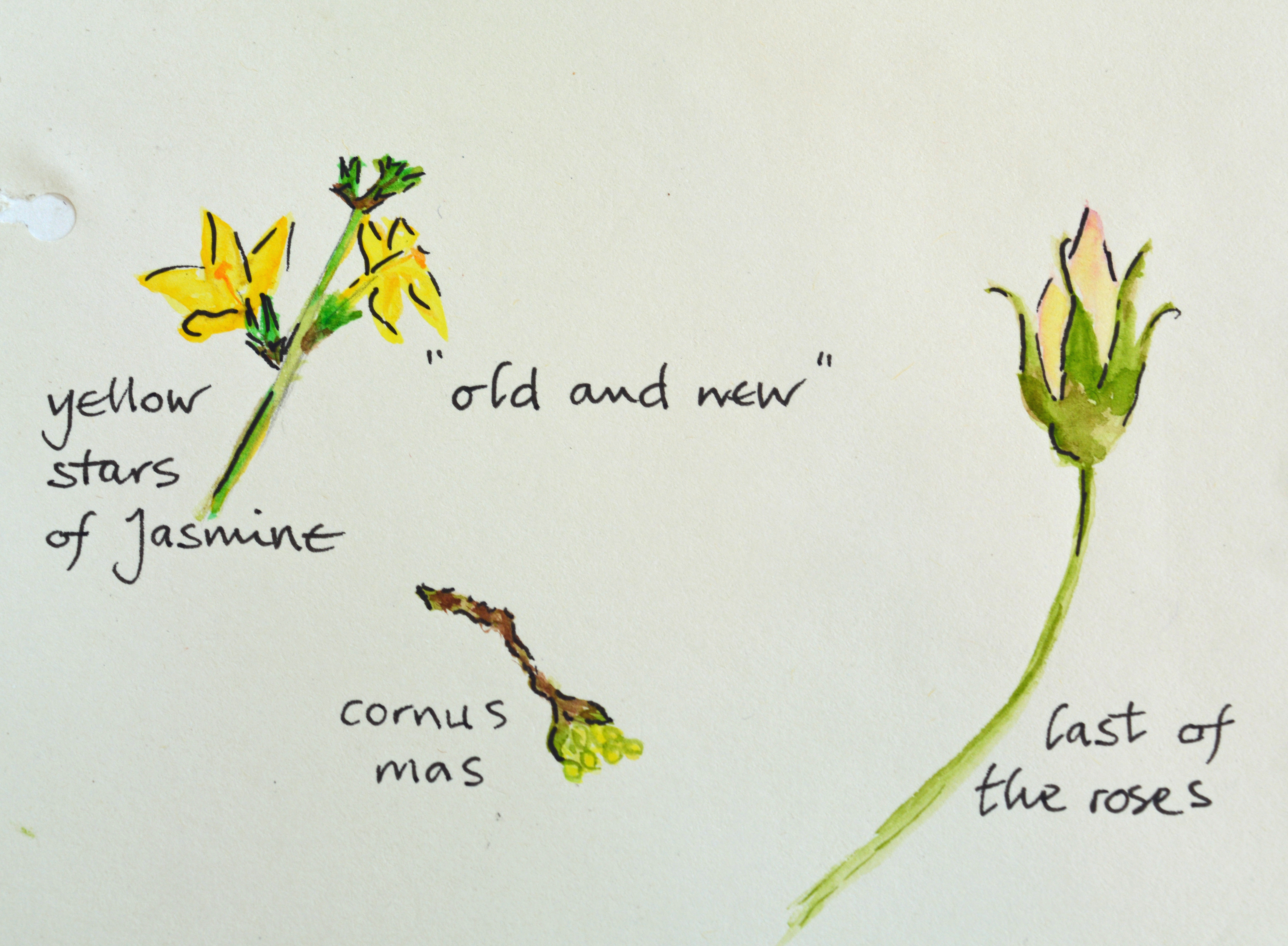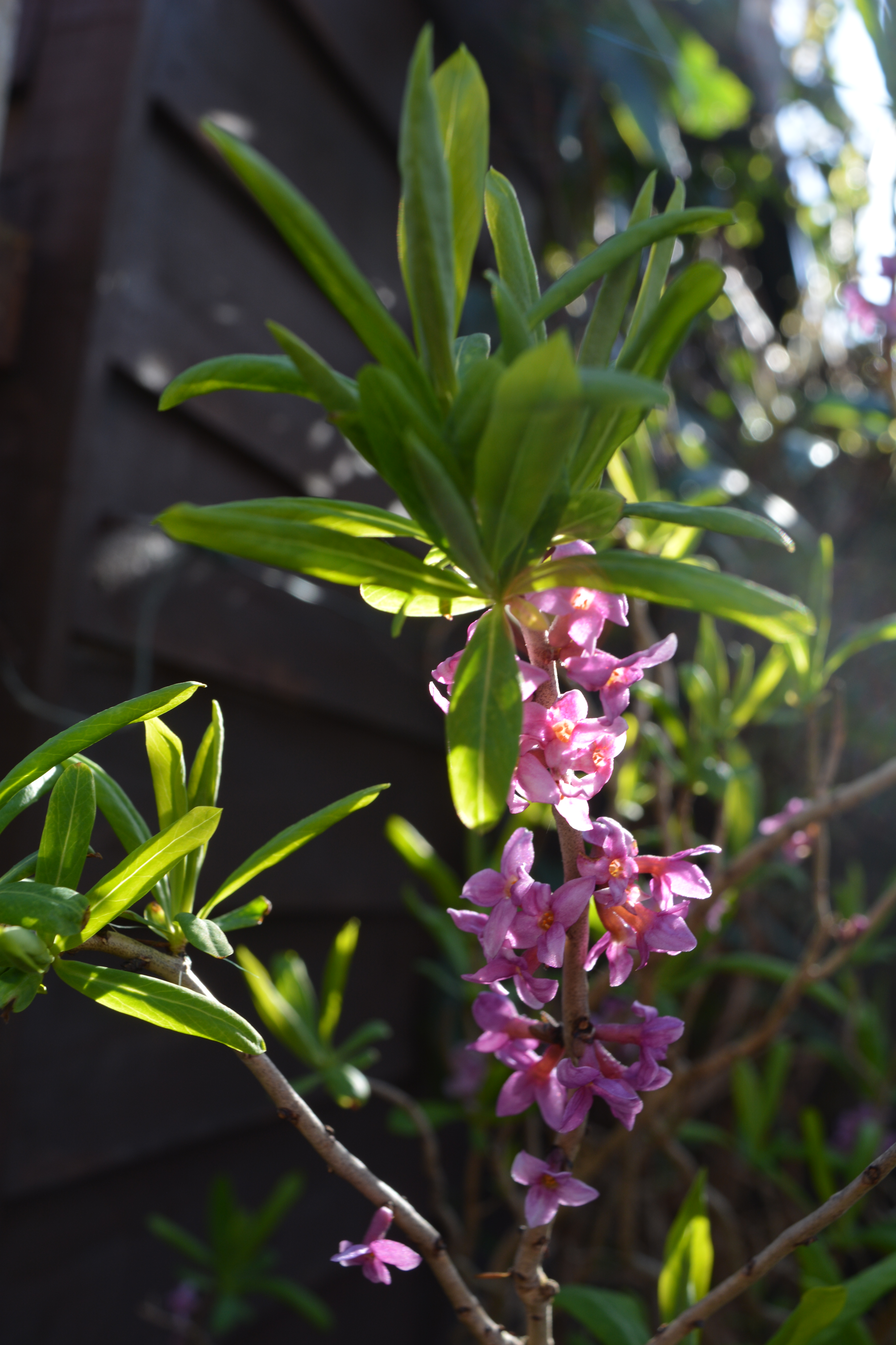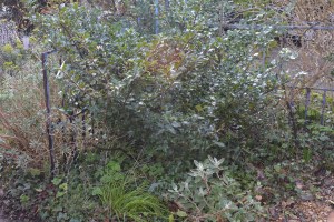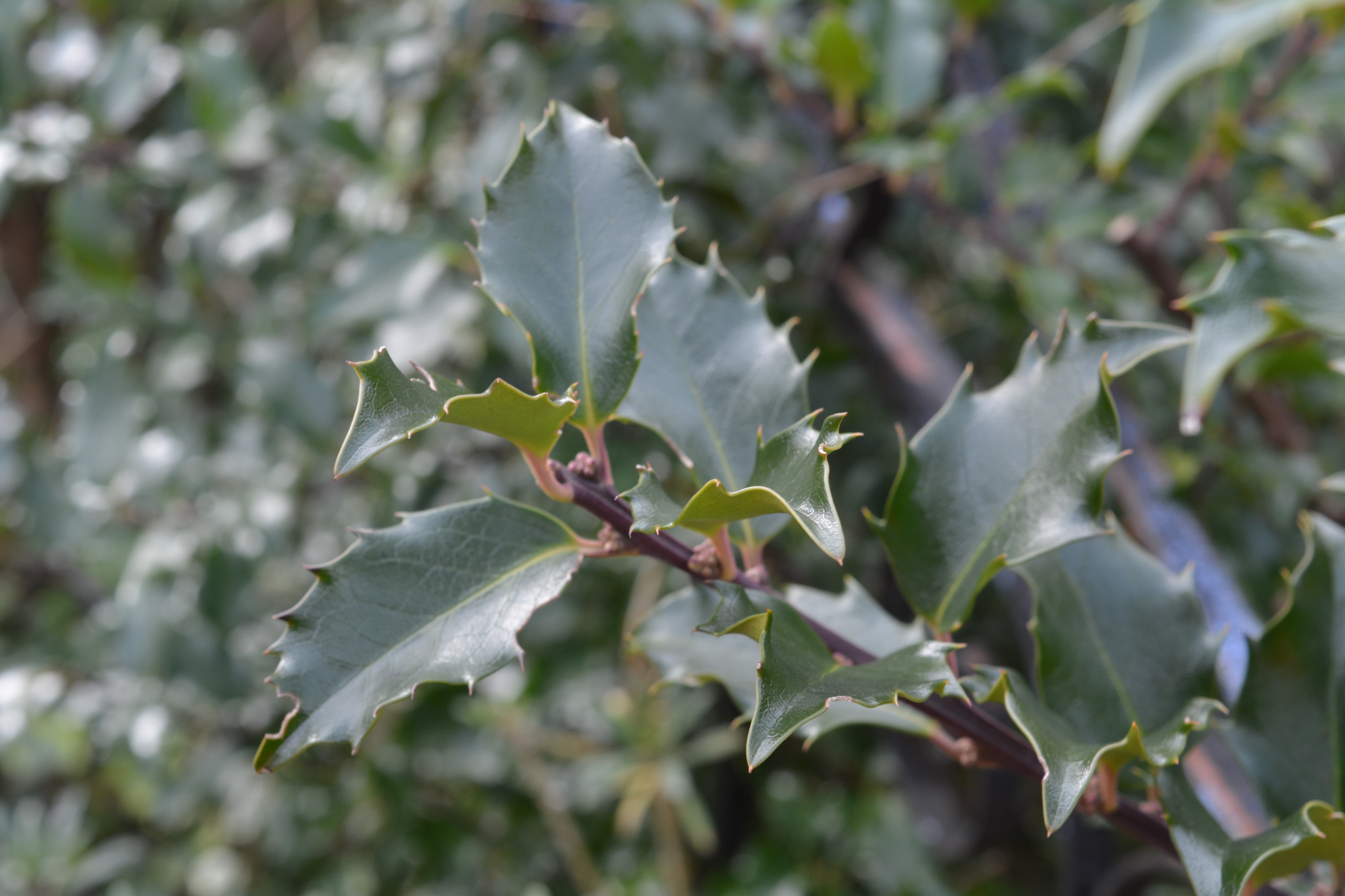 Snowdrops in drifts light up the ground beneath the tree. Ilex “Ferox” sparkles with variegated leaves curled and heavily spined, probably one of the best hollies available for the small garden.