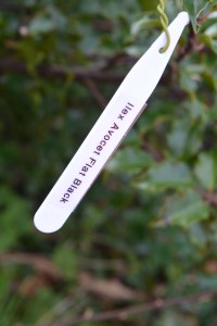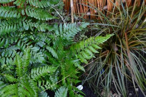 Metal panels with cut-out shapes of fern leaves reflect the planting beneath them in the border. John features many different versions of the low growing evergreen shrub, Leucothe. This one was a real beauty!