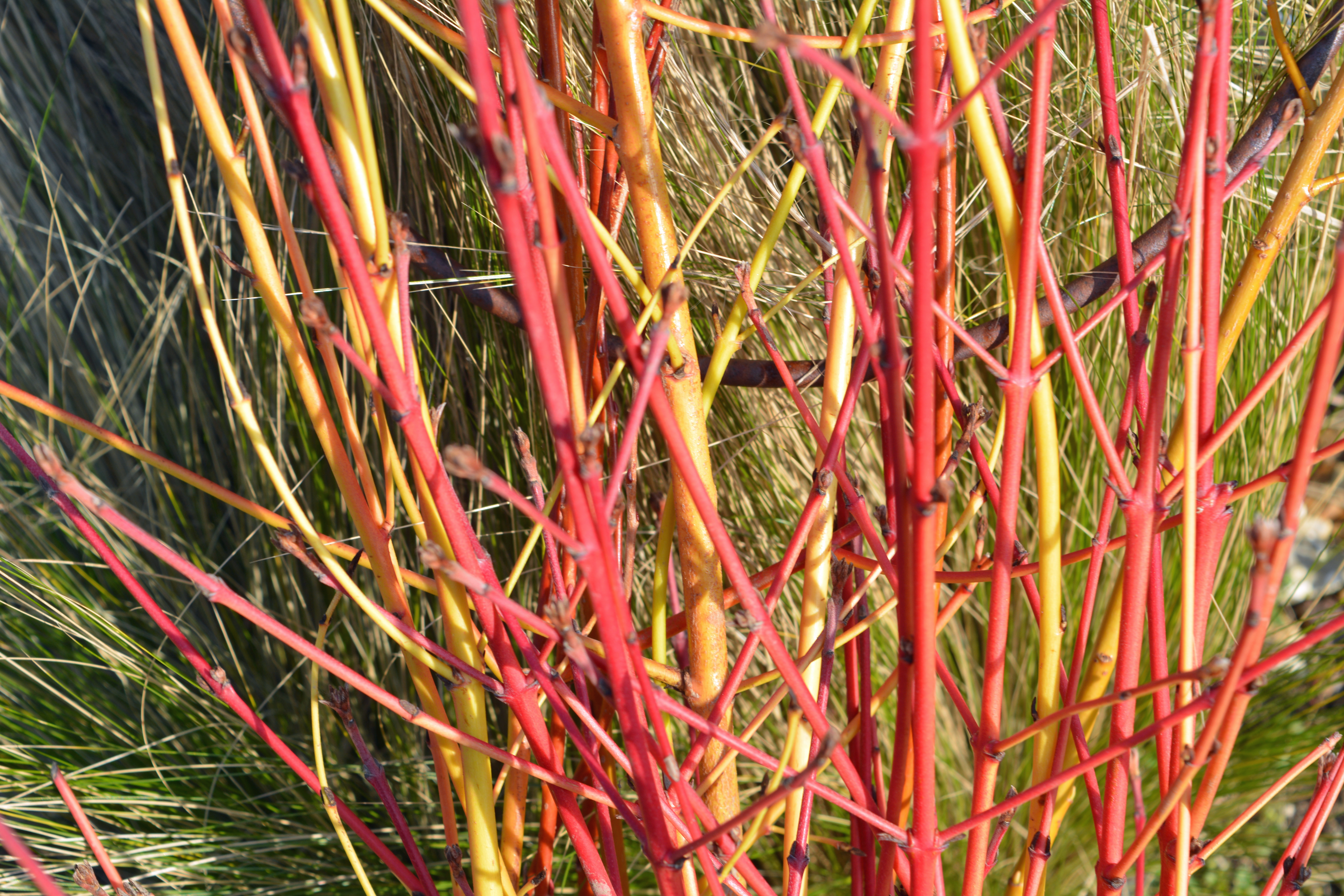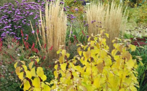 Conifers, grasses and trees and shrubs with coloured stems and bark give a common theme throughout. The first two photos below show the matching gold coloured foliage of a group of conifers and a swathe of grasses.